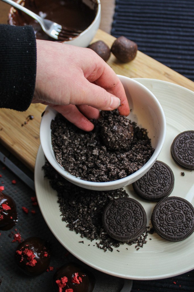 1. Finely chop the Oreos or pulse them in a food processor for a few seconds and place them in a bowl. One at a time, roll the remaining 6 truffles around in the bowl, completely covering them in the crushed Oreos and then place them back on the baking sheet.