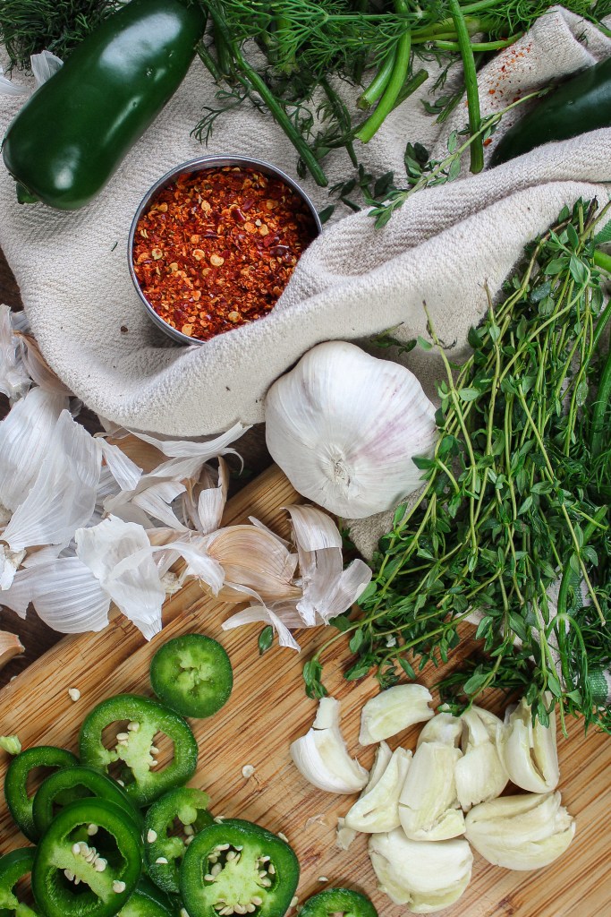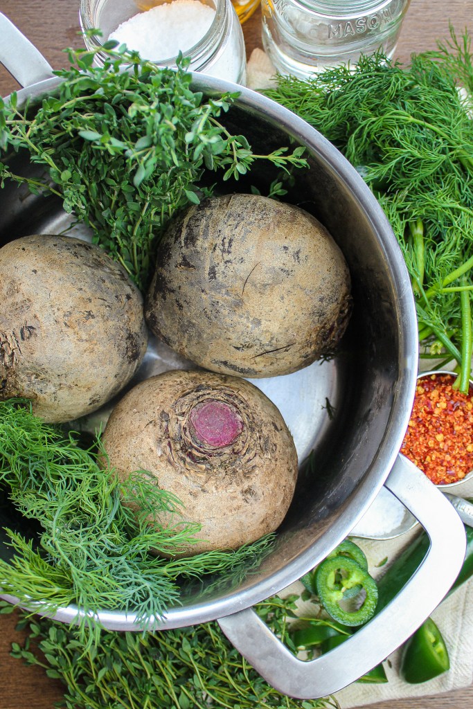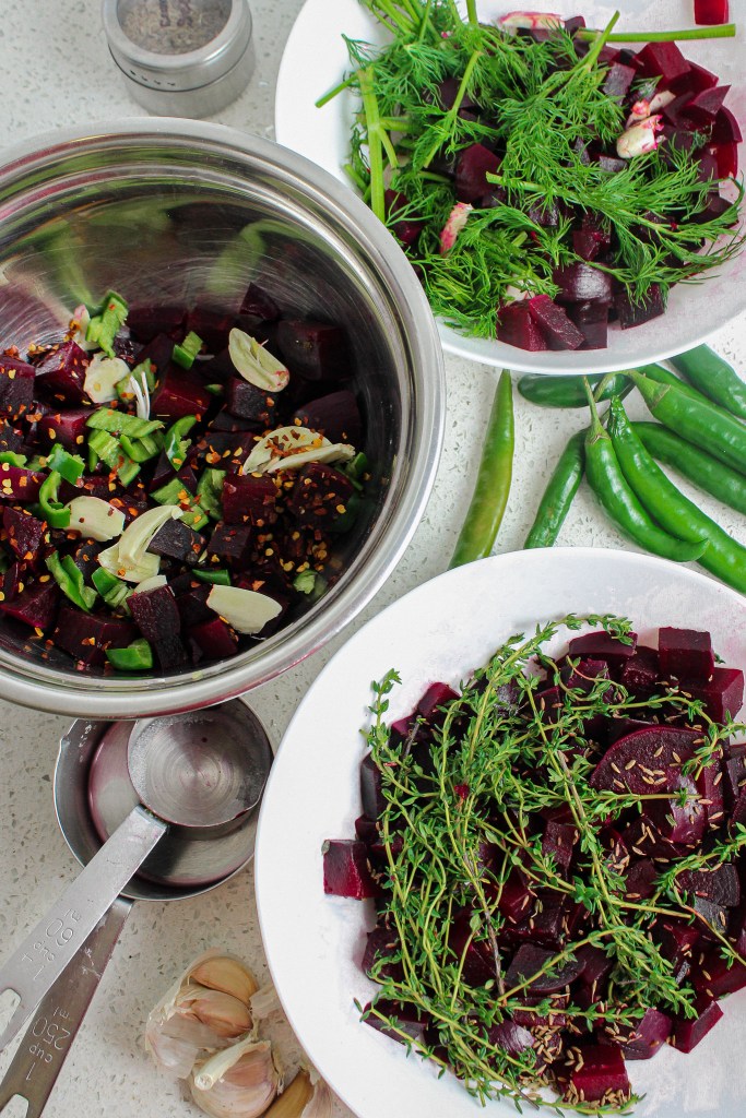 4. Place the ingredients for your chosen beet variation (dill & garlic, thyme & cumin, or jalapeño spice) into a litre container or jar. Add the beet in and then pour the liquid over top and let sit at room temperature for 1 hour.