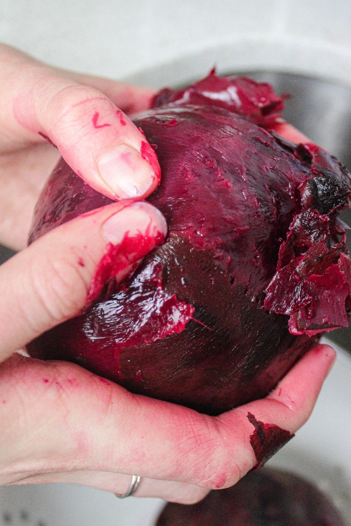 3. When the beet is cool enough to handle but not all the way cooled down, peel and then slice or cube the beet as desired.