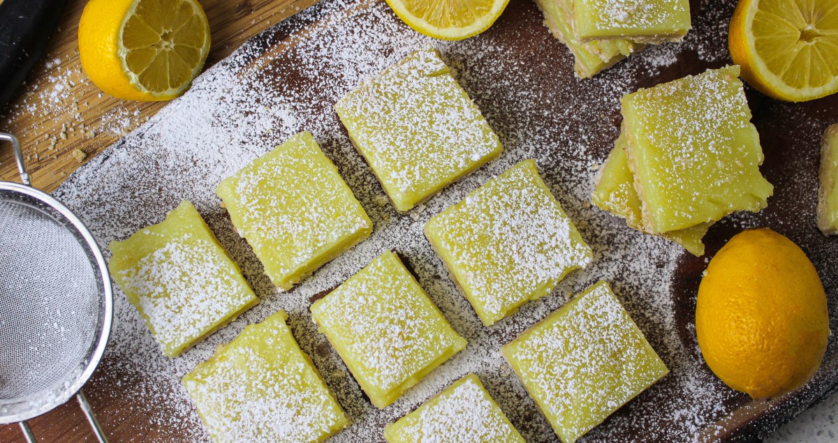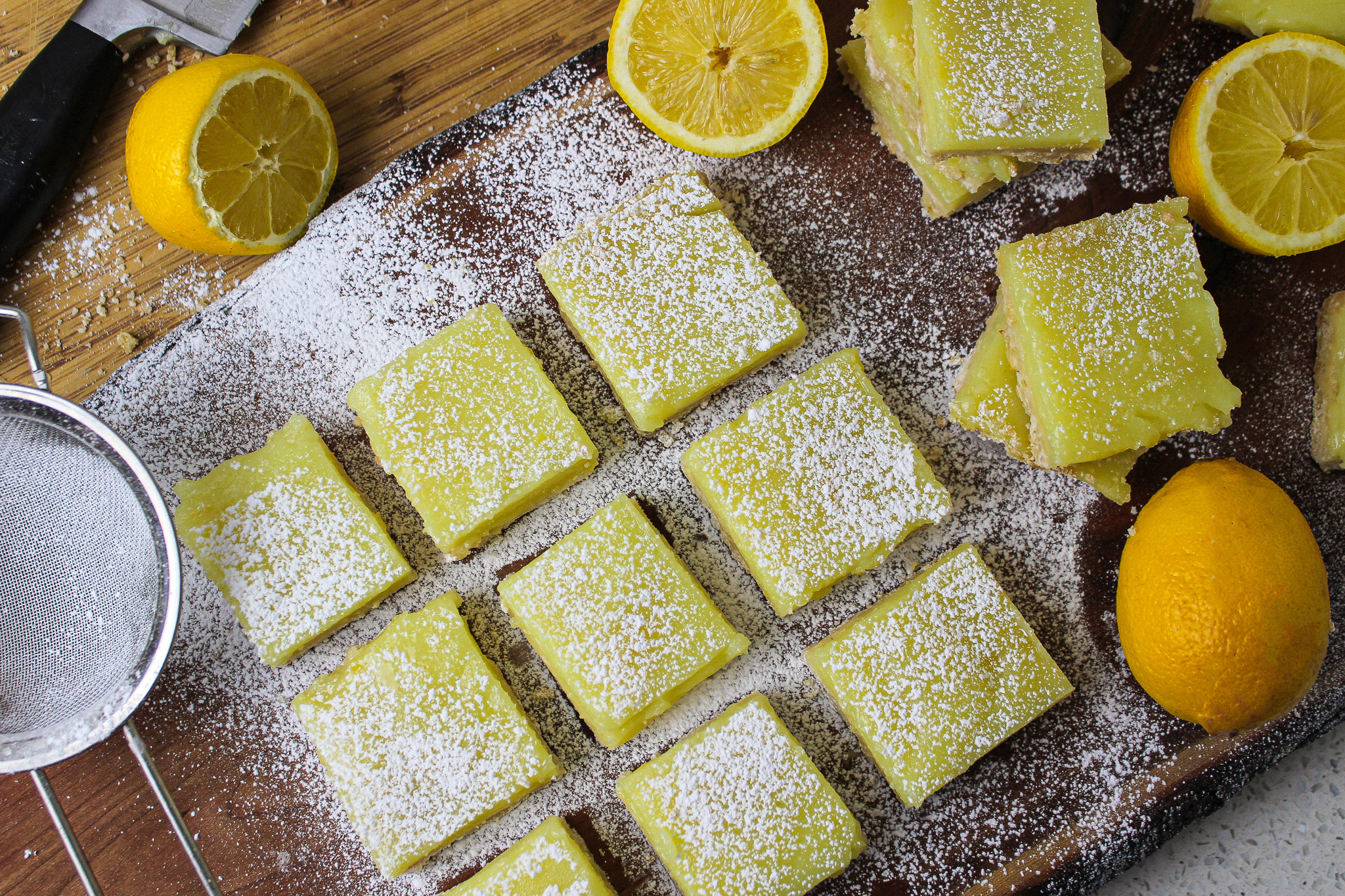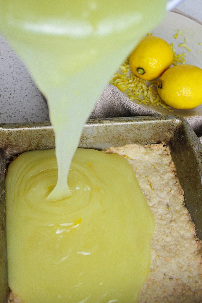 4. Pour the curd over the cookie base and spread it evenly with a spatula. Place the bars in the fridge to chill for at least 4 hours or overnight and then slice them up, dust icing sugar over top of the bars, and enjoy!