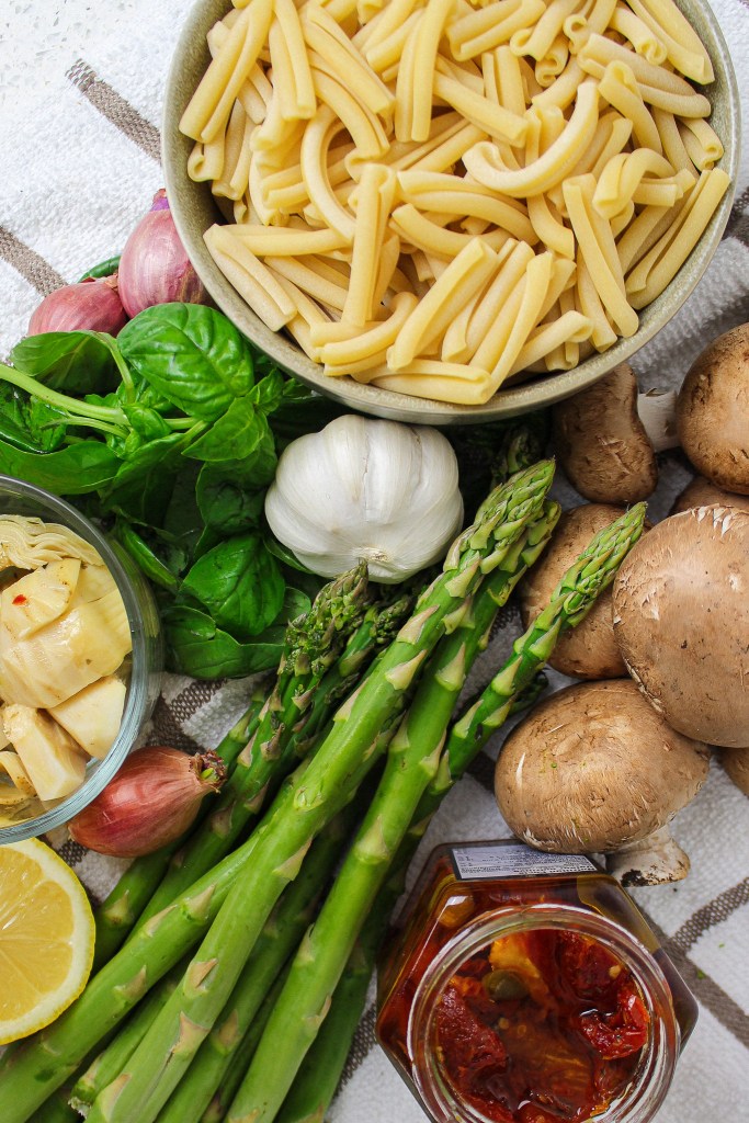 Sticking with seasonal produce as well as some of our favourite go-to’s, we opted for a combination of fresh and marinated veggies. Asparagus, shallot, and artichoke are the seasonal veggies we chose. We know that fresh artichoke is time-consuming and a little tricky to cook, so we chose to use marinated artichoke for simplicity and flavour. To add even more of that rich and salty flavour, we’ve included sun-dried tomatoes in oil as well as using the oil itself in the cooking process to really enhance the flavours of the dish. These mushroom lovers couldn’t help ourselves from adding cremini shrooms that are beautifully browned and charred. A simple and light sauce is made using oils, fresh lemon, and pasta water, and the final burst of freshness comes from basil to balance the dish out.