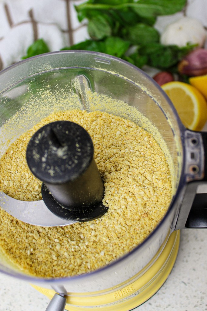2. Make the cashew parm. Place cashews, nutritional yeast, and salt in a food processor and pulse until everything is crumbled. Add the dehydrated garlic and onion flakes or powder, if using, and pulse for a few seconds. Set aside.