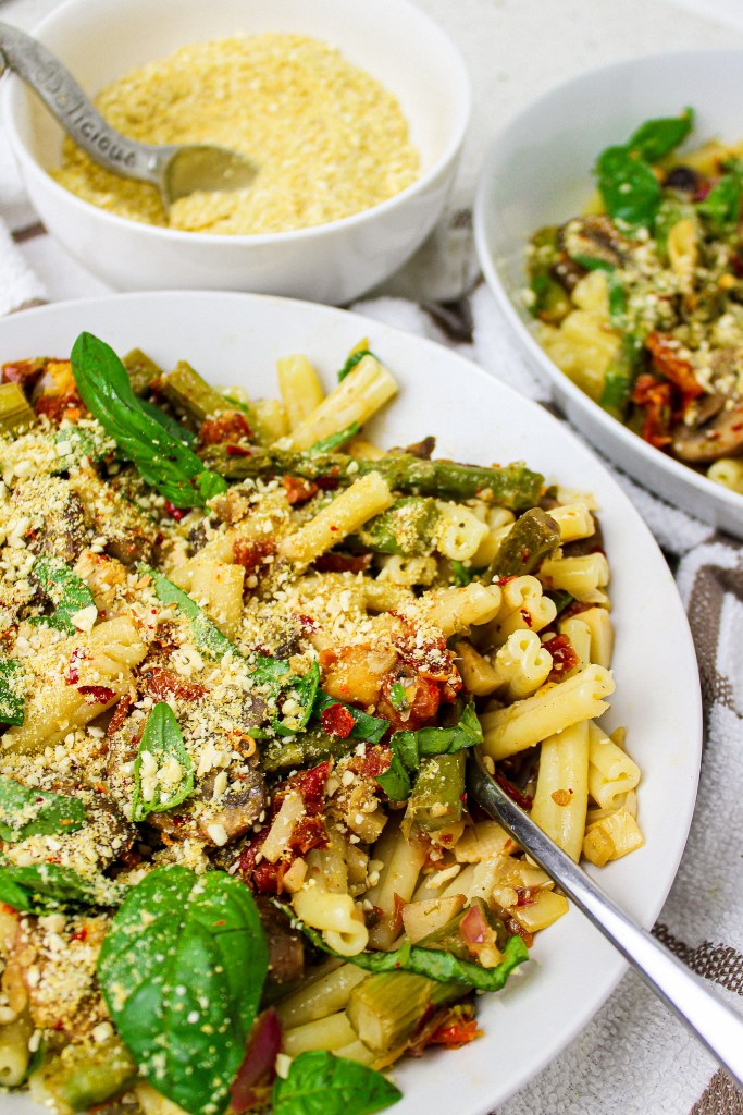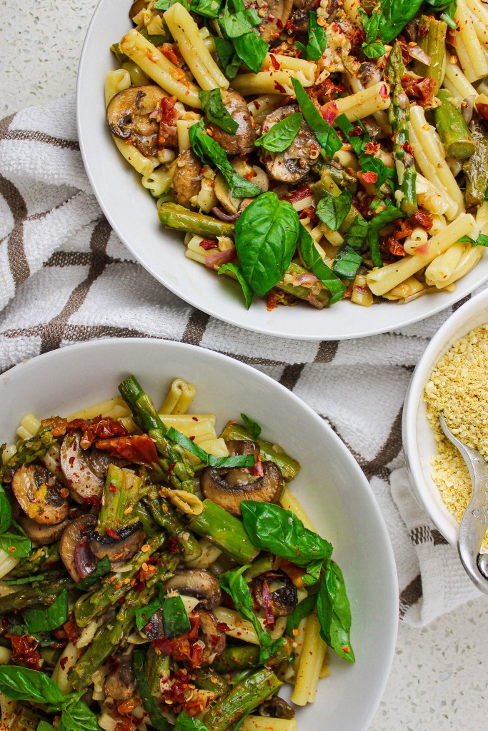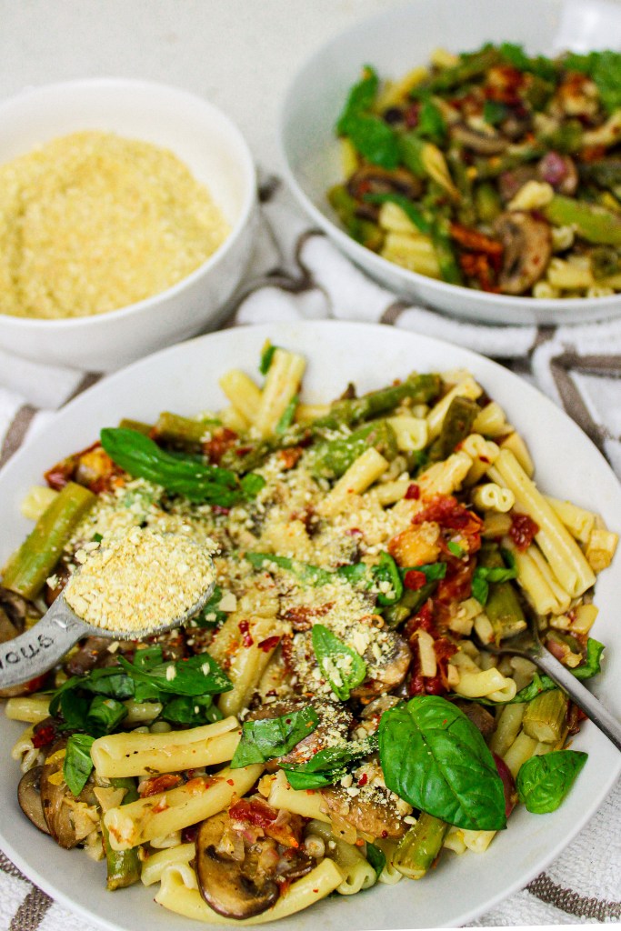 This pasta dish highlights one of our favourite seasonal veggies, asparagus, and is packed with tons more flavourful vegetables, both fresh and marinated. Fresh basil, lemon, and homemade cashew parm bring this dish together for a bright, yet comforting meal that is perfect for warm weather!