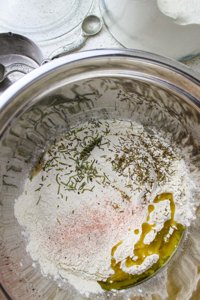 2. Add the flour, rosemary, thyme, salt, and 1 tablespoon of olive oil and stir again until everything is incorporated.