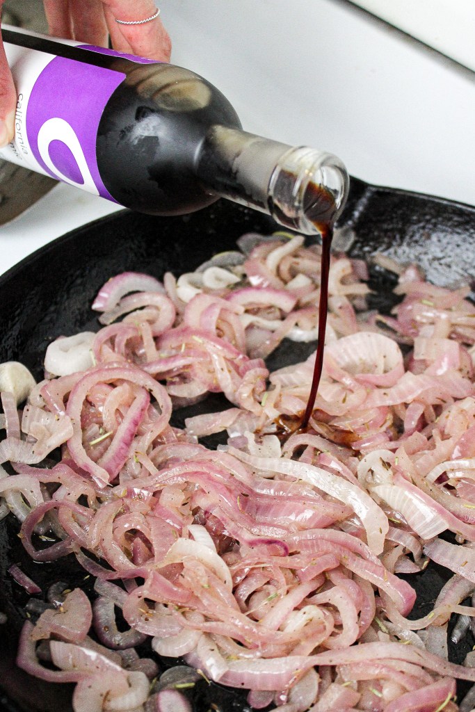 5. Make the caramelized balsamic onions. Heat a pan over low-medium heat and add 1 tablespoon vegan butter. Once it is melted, add the thinly sliced red onions and let them cook low and slow for 10 minutes. Add the salt, pepper, rosemary, and thyme and cook for another 7-8 minutes until they are soft, translucent, and starting to brown. Add the balsamic vinegar, turn the heat up to medium-high and cook for 2-3 more minutes then remove from the pan and set aside.
