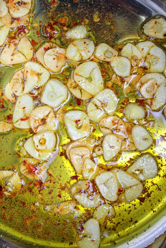 7. Make the olive oil base. Add the olive oil to a small saucepan over low-medium heat and allow it to heat up. Add the thinly sliced garlic and cook for about 8-10 minutes, stirring often, until the garlic is just starting to turn golden-brown. Add the chilli flakes, stir, and then remove from the heat and set aside.