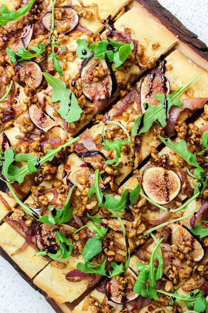 9. Pierce the risen dough with a fork all over and then spread the olive oil mixture across the dough. Add the caramelized balsamic onions and sliced figs and bake for 20 minutes. Remove from the oven and drizzle the flatbread with balsamic glaze and then top with smoky walnuts, arugula and chilli flakes. Slice into thin pieces and serve warm.