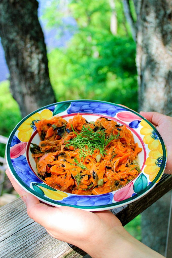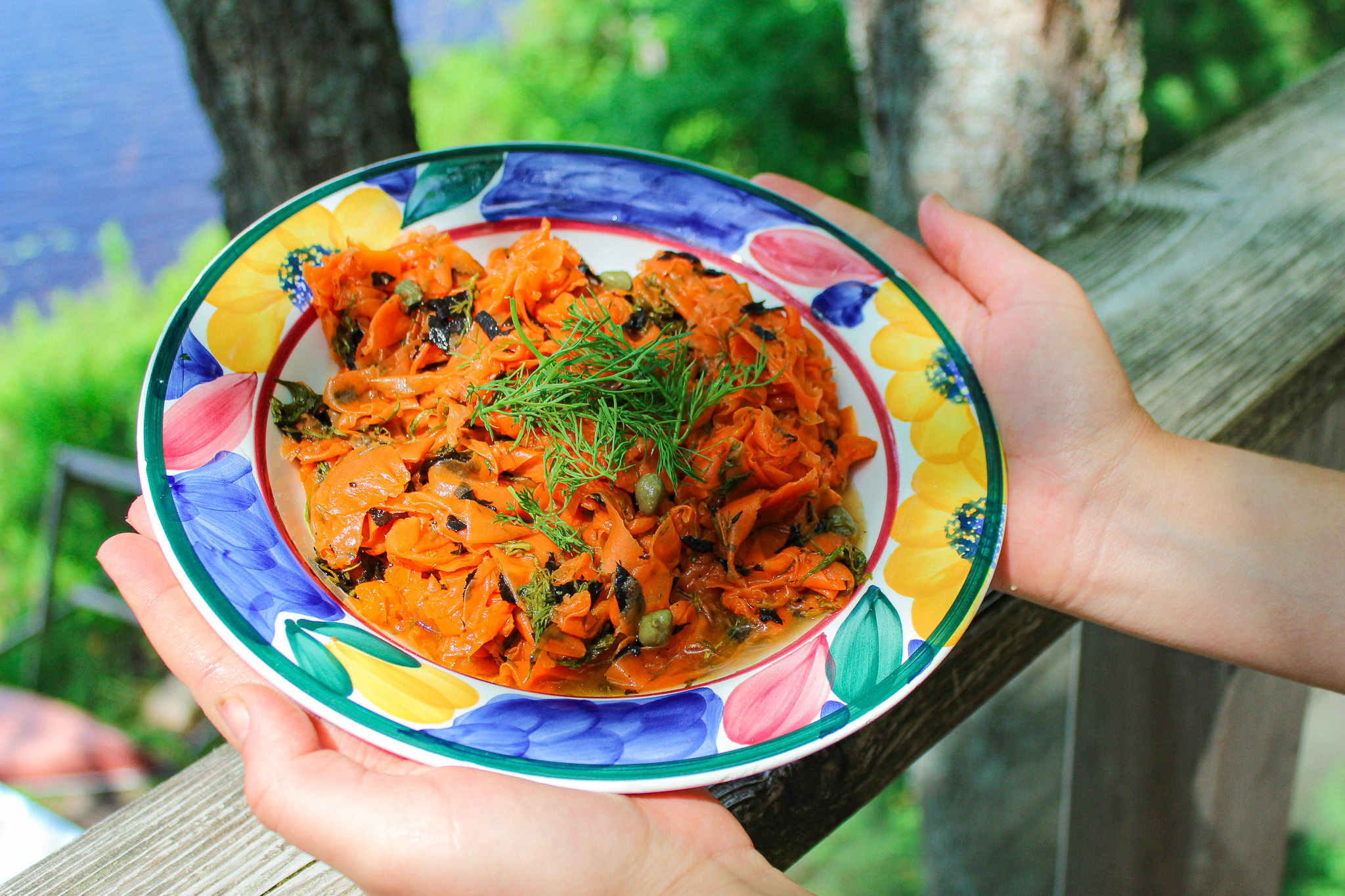- In a container with a lid, mix together the olive oil, lemon juice, caper brine, capers, liquid smoke, dill, nori, and salt and pepper to taste. Transfer the carrots to the container and toss them well to make sure they are all completely coated in the marinade. Put the lid on the container and place it in the fridge and allow them to marinate for at least 2 hours, but preferably overnight.