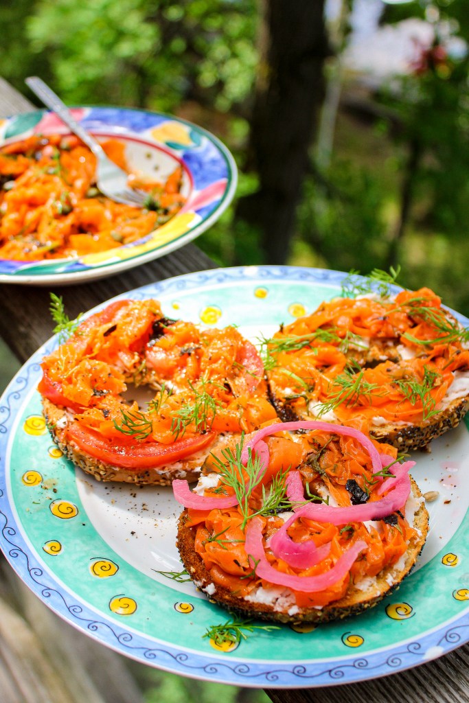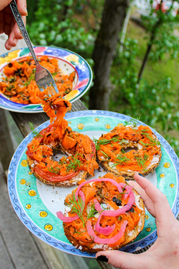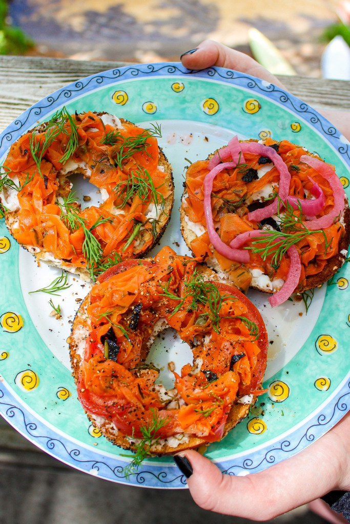 Weekend brunch is something we look forward to all week long! We love switching it up between tofu scram, avo toast, pancakes, and this recipe we’re sharing today. Vegan carrot lox is our take on classic smoked salmon, a brunch food we both loved before going vegan. Carrots do an incredible job at taking on the smoky, umami, and savoury flavours of the marinade and the bright orange colour of the carrots give total smoked salmon vibes.