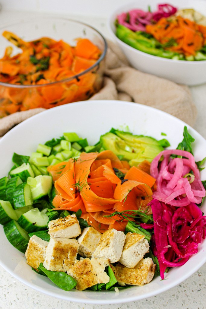 There are so many ways to enjoy vegan smoked salmon, the classic being on a bagel with cream cheese. We also love to add tomato, cucumber, quick pickled red onions, and fresh dill, but you can add whatever you like to your bagel creation! Carrot lox makes a great addition to salads as well as piled-on crackers spread with vegan cheese for your next charcuterie board.