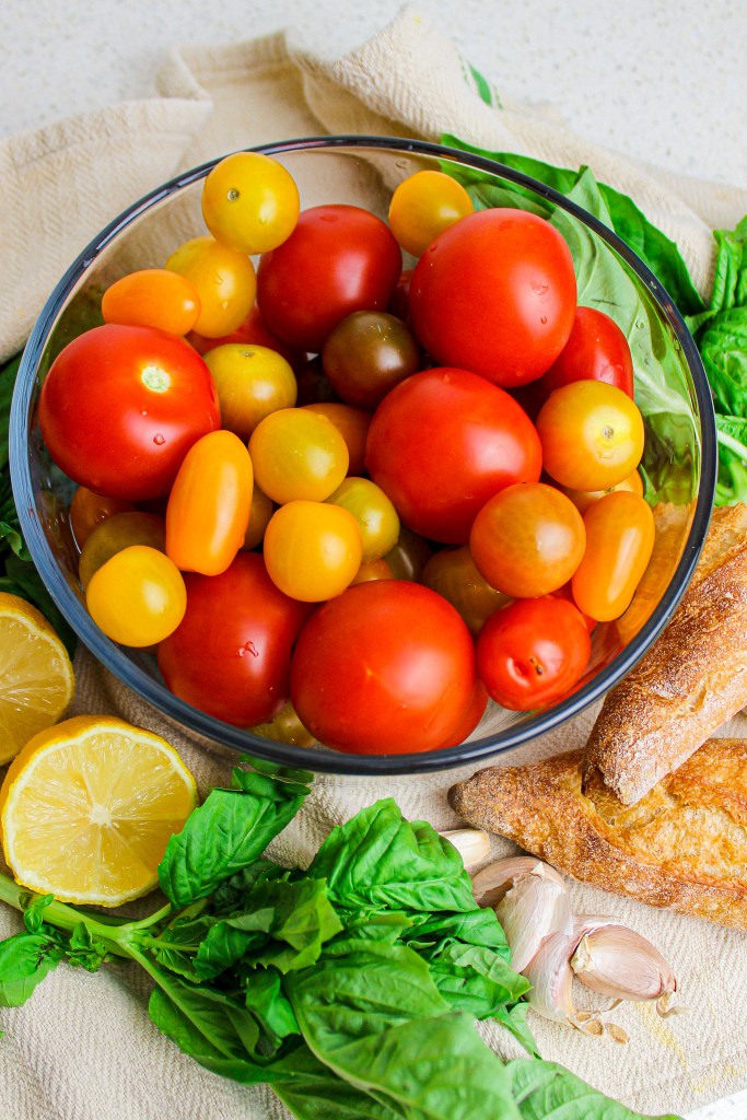 2. When making this in the summer, we love using tomatoes from family or friend’s gardens or locally grown tomatoes of any variety. Otherwise, we try to find heirloom or multicoloured baby tomatoes to brighten up the dish.