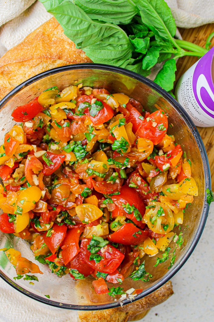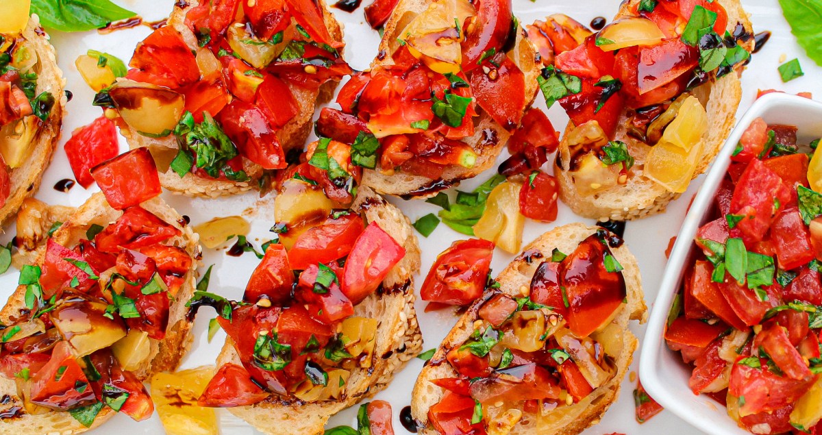 Tomato bruschetta on fresh baguette doesn’t get any easier than this light and refreshing recipe. It is a go-to appetizer that is quick, simple, and will leave everybody coming back for more!