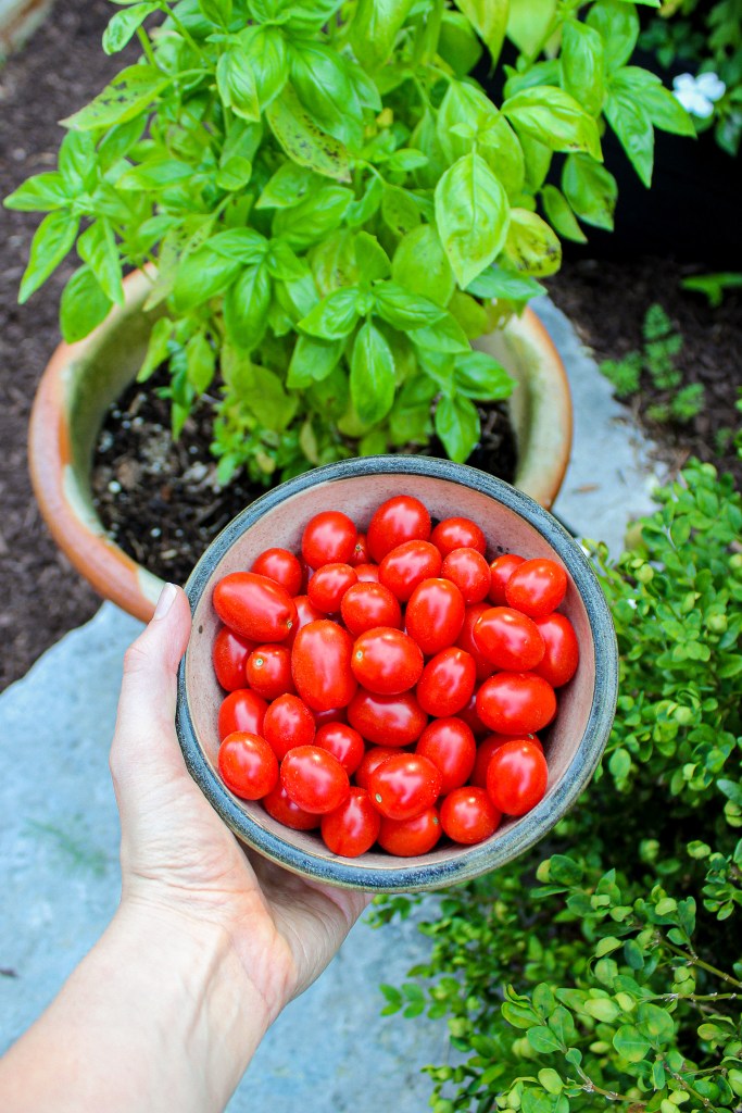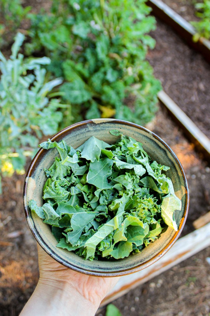 Switching up our usual quinoa base, we opted for nutty farro that is starting to become our go-to ancient grain. It has both protein and fibre, and the earthiness of this grain pairs super well with the rest of this bowl’s wholesome components, including the tomatoes. You might recognize these blistered tomatoes from our Super Green Pesto because we just can’t seem to get enough tomatoes during this season. We couldn’t pass up the opportunity for some homegrown kale and basil, which also added the perfect fresh component to these bowls – shoutout to Zoey’s dad, aka papa spicy 😉