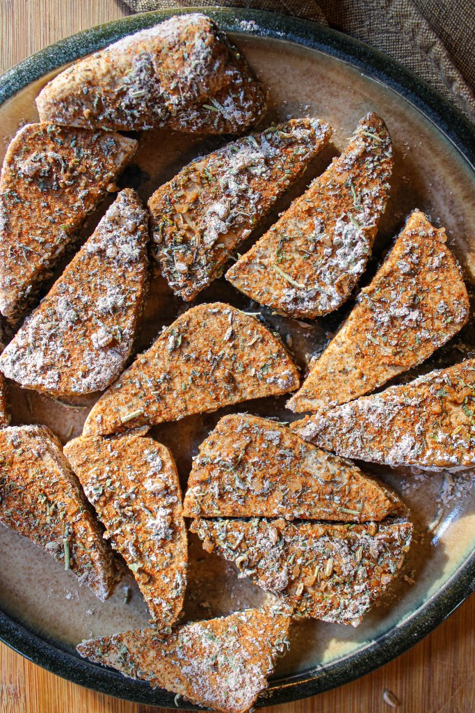 - When the tofu is marinated, heat a cast-iron skillet or pan to medium heat and add the oil of your choosing. Take each piece of tofu and coat it in the spice blend. Cook the tofu for 3-4 minutes per side until it is nice and crispy. Remove from the heat and set aside.