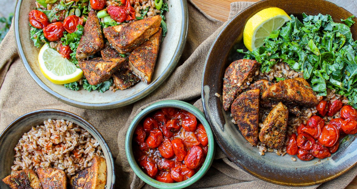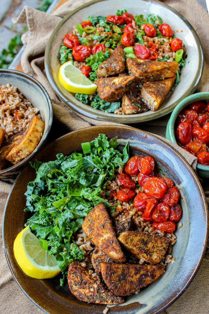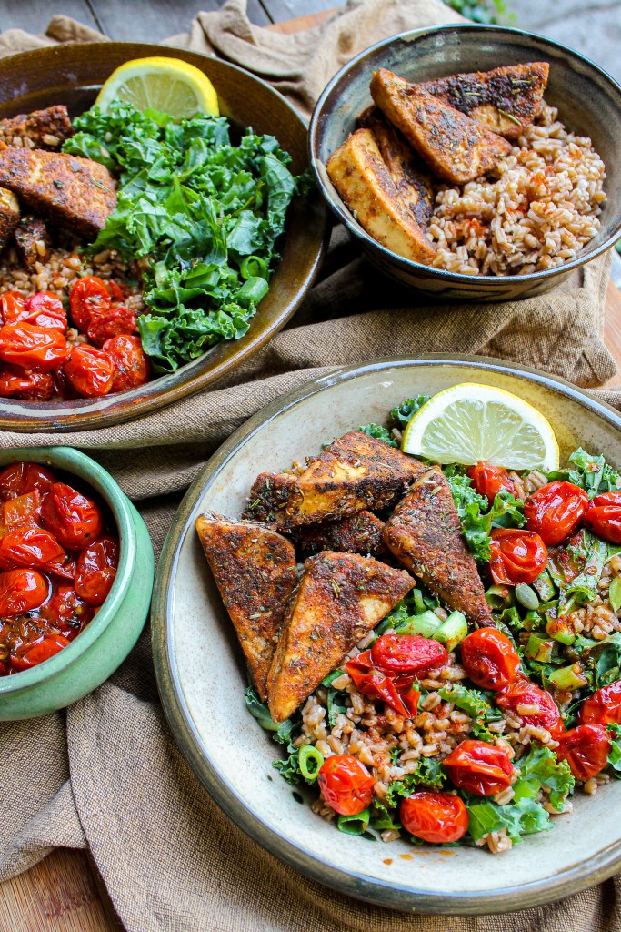 Marinated and seasoned crispy tofu, broiled tomatoes, fresh kale, and basil on a bed of hearty farro is a bowl that you're going to want to try. It's packed with flavour and makes for the perfect meal-prep or comforting dinner.