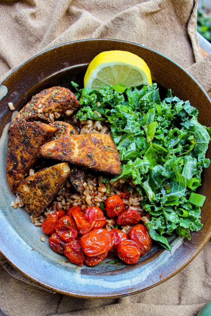 Marinated and seasoned crispy tofu, broiled tomatoes, fresh kale, and basil on a bed of hearty farro is a bowl that you’re going to want to try. It’s packed with flavour and makes for the perfect meal-prep or comforting dinner.
