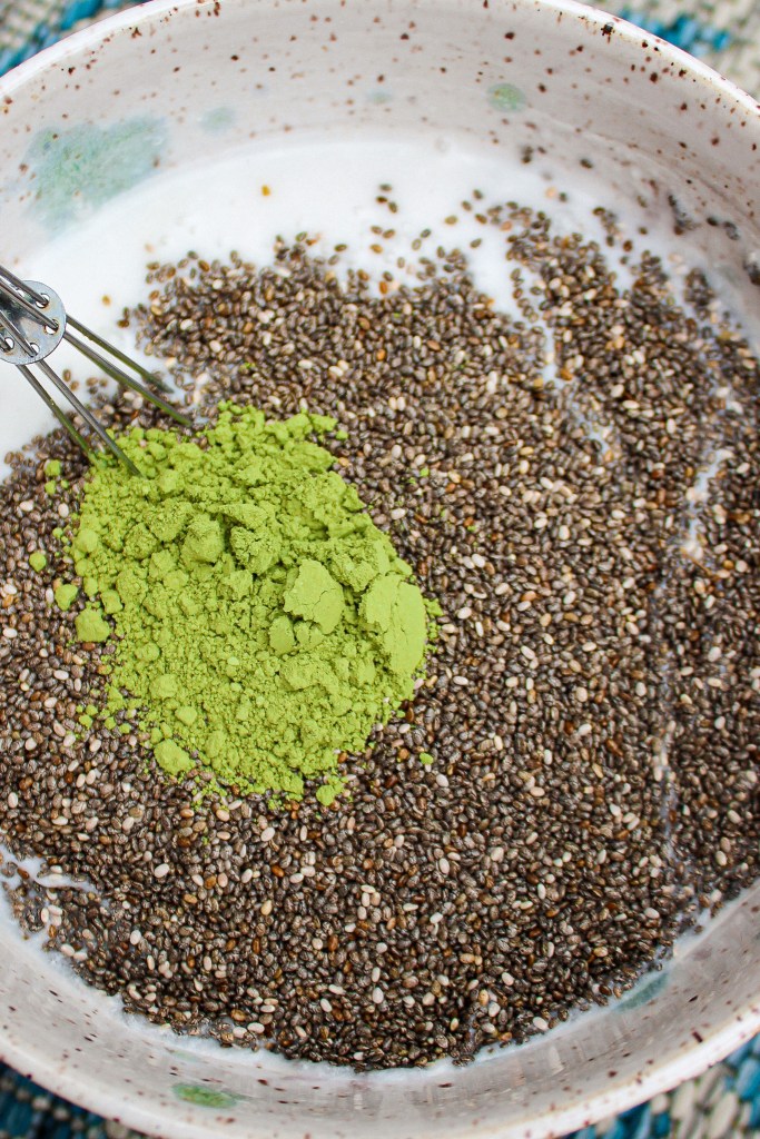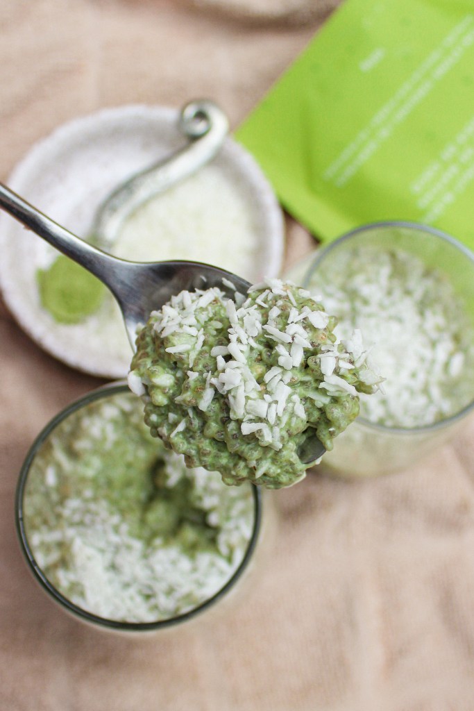 Matcha coconut chia pudding is super creamy, beautifully balanced, and gets texture from shredded coconut.