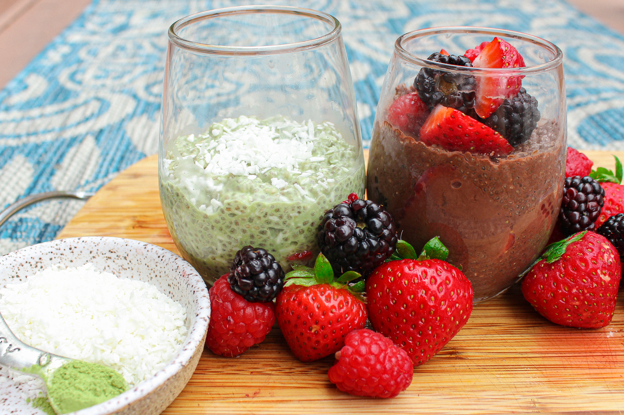 Chia Pudding 2 Ways – Matcha Coconut & Chocolate Mixed Berry