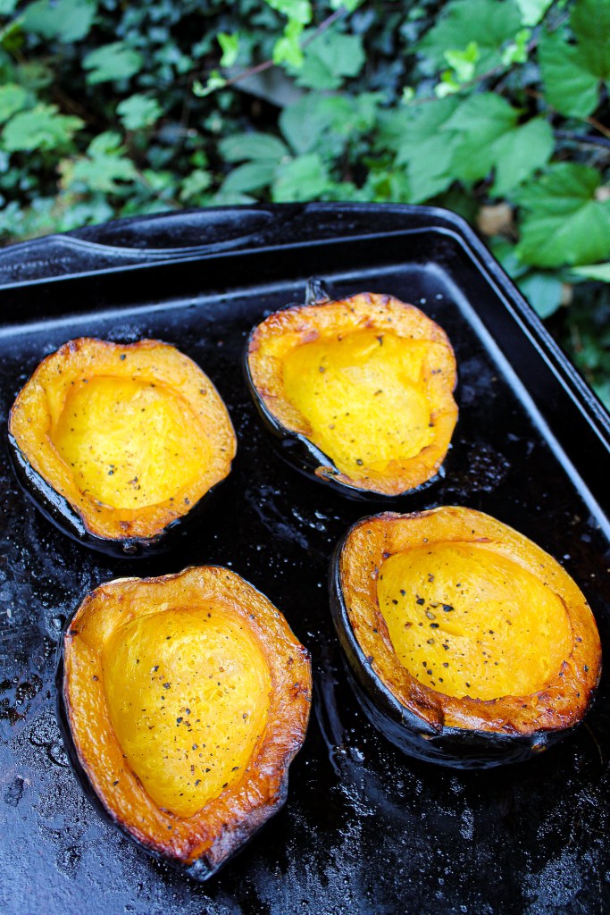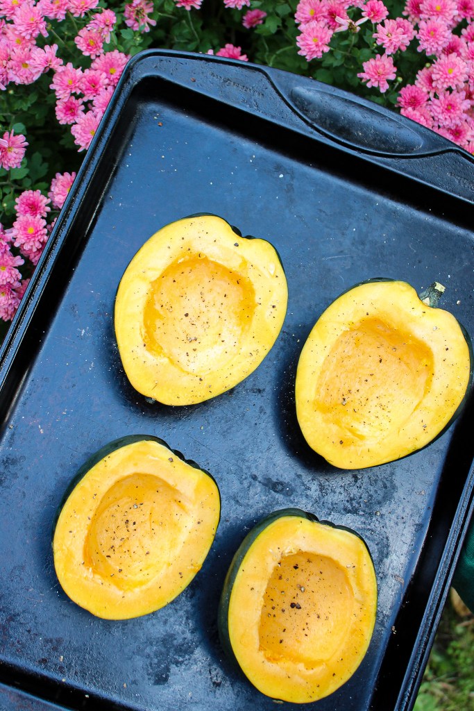 2. Cut each acorn squash in half and scoop out the seeds. Put 1/2 a tablespoon of olive oil on each half and then sprinkle with salt and pepper. Place each squash cut side down and roast in the oven for 35-40 minutes, until fork tender. Remove from the oven and set aside.