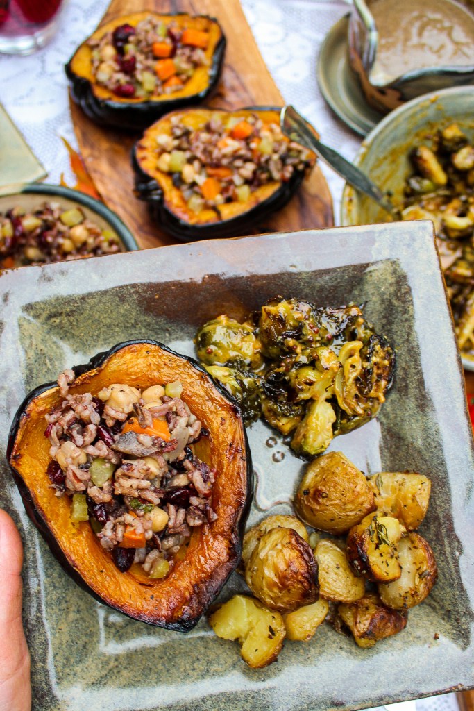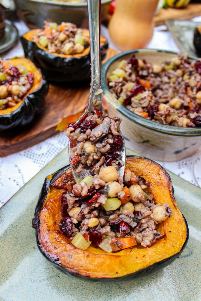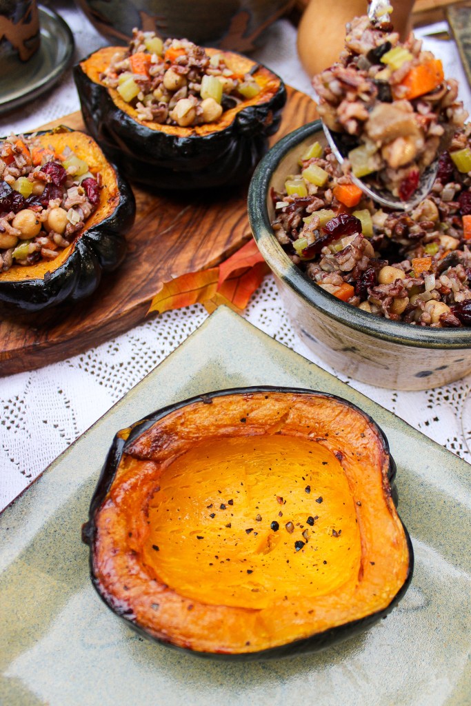 6. Using a spoon, divide the wild rice stuffing between the roasted acorn squash halves. Serve immediately.
