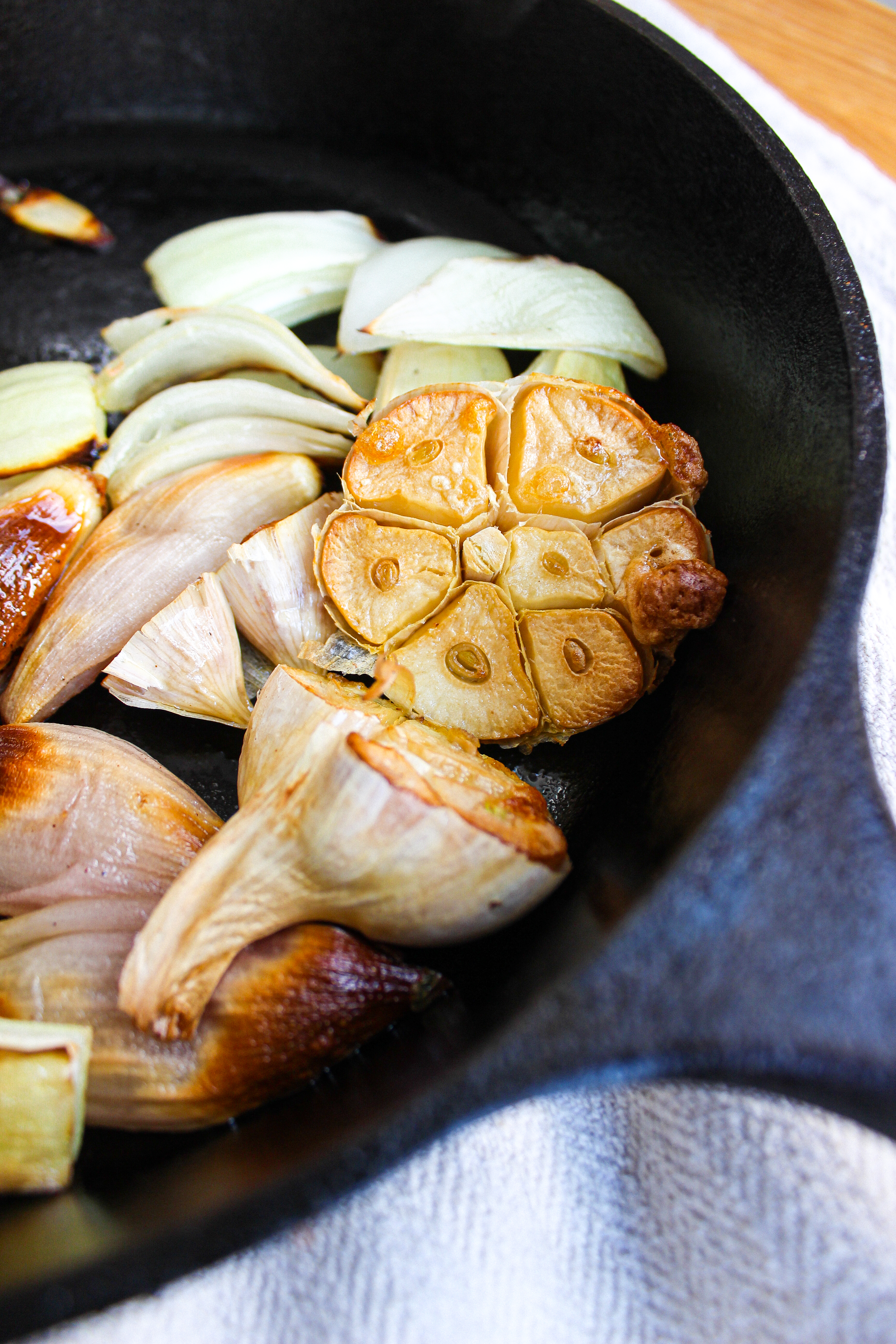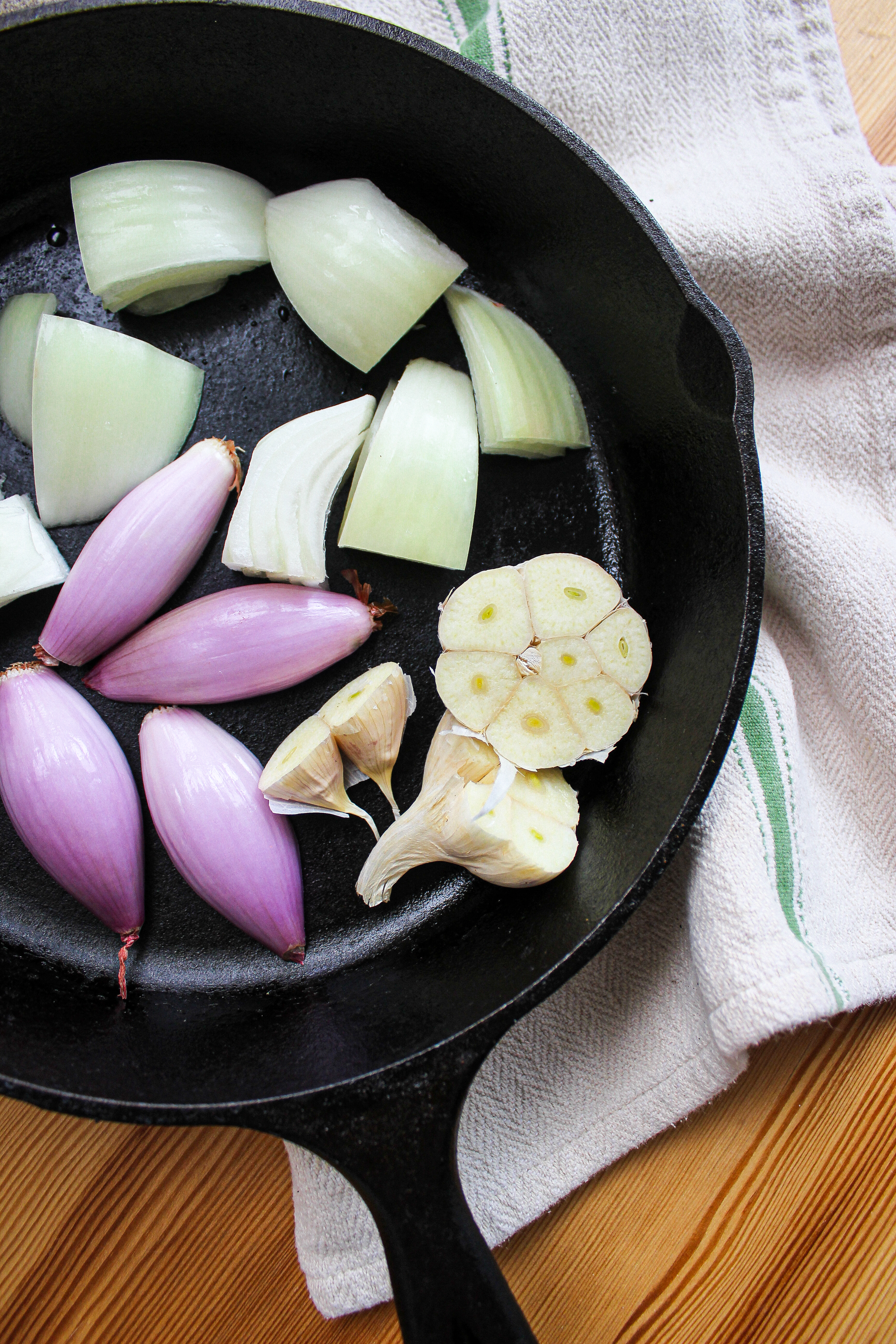 1. Preheat the oven to 400°F (204°C). Place the shallot, onion, and garlic on a lined baking sheet, toss with a tablespoon of olive oil, and roast until they are all soft and golden-brown, about 20 minutes. Pay close attention as the garlic and shallot may need to be removed before the onion. Remove from the oven and allow to cool for 10 minutes.