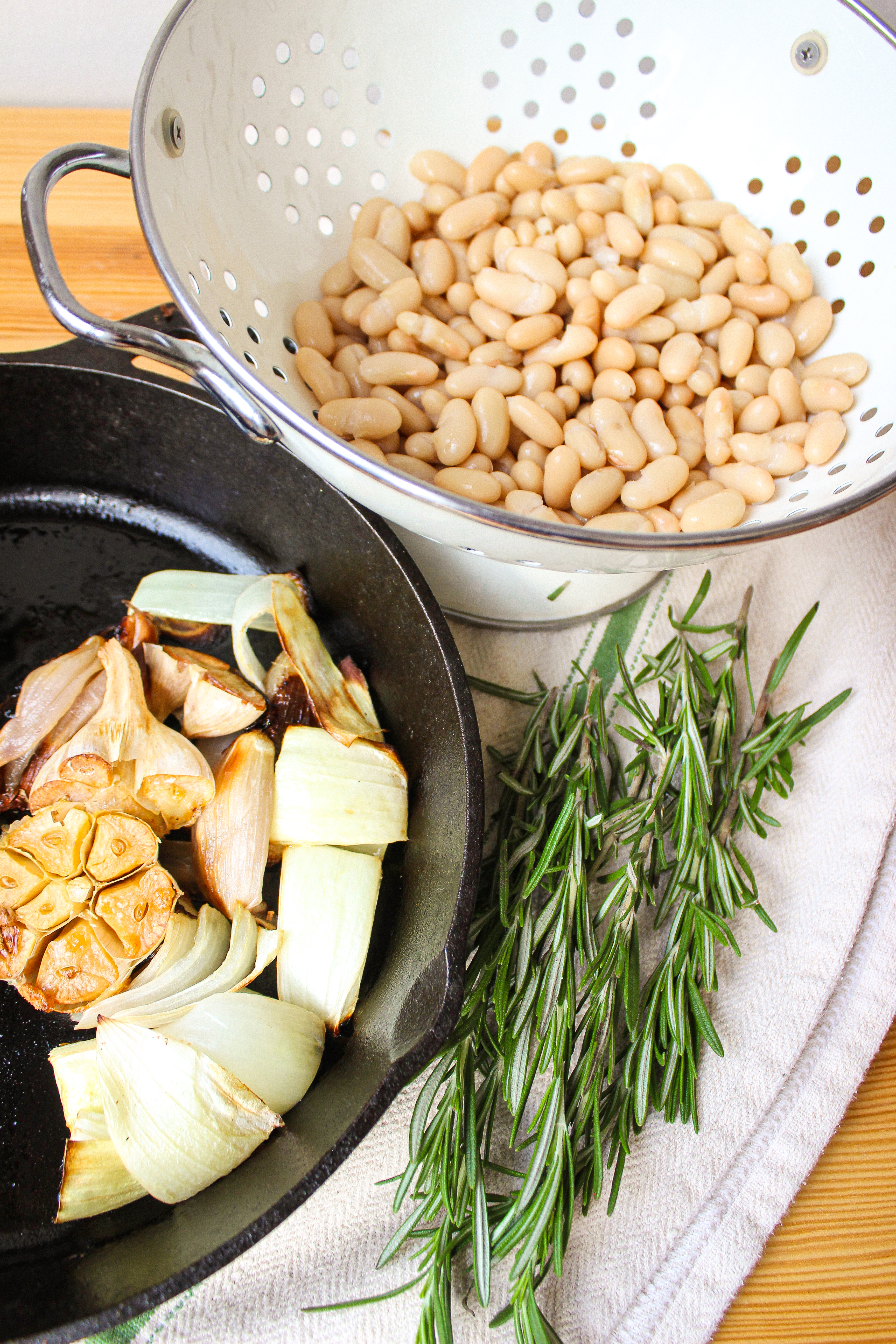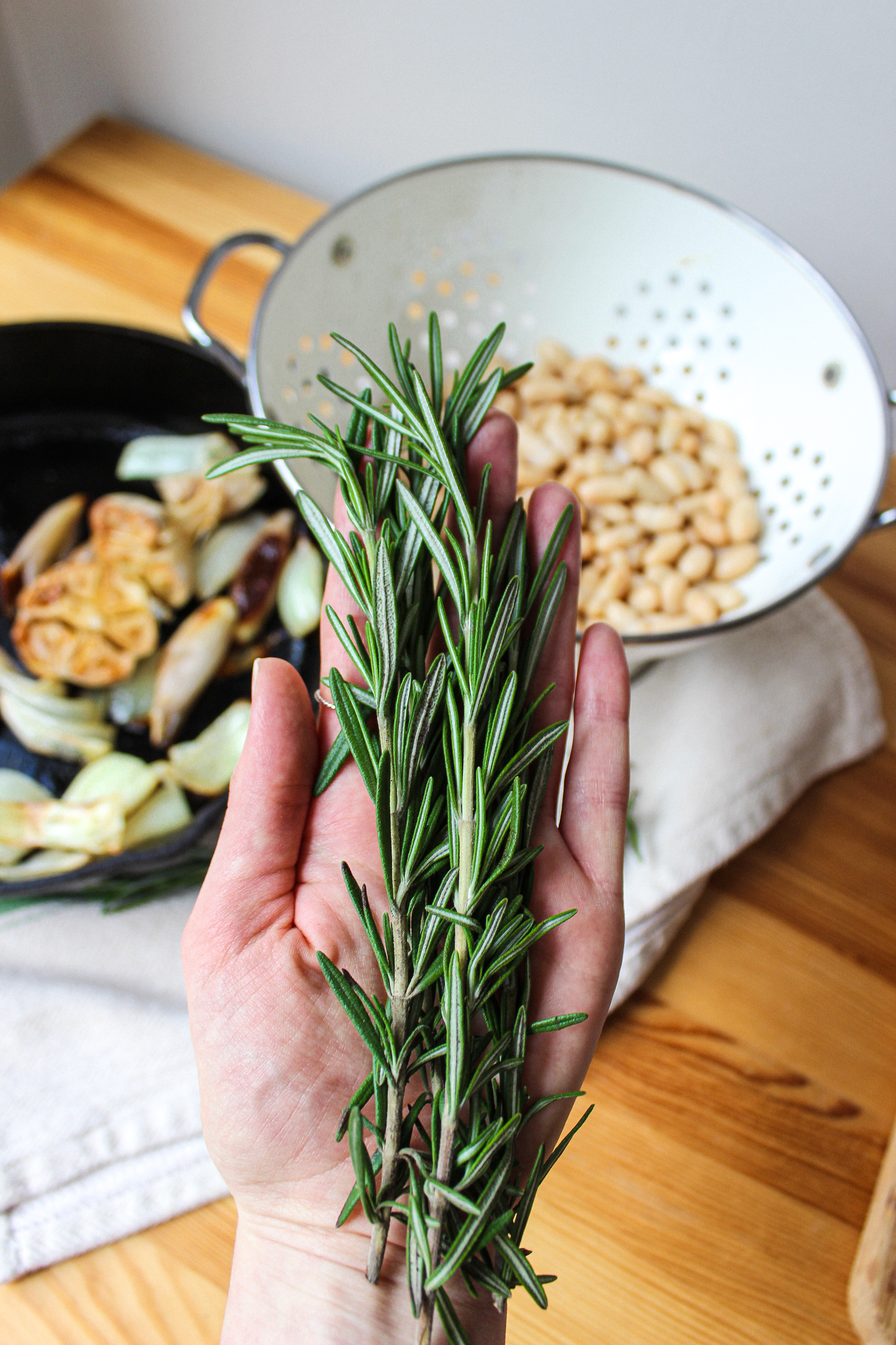 2. In a food processor, add the roasted shallot, onion, and garlic (squeeze the cloves out of the skin), cannellini beans, lemon zest and juice, rosemary, sage, garlic powder, onion powder, sumac, salt, and pepper. Process for 1-2 minutes. Slowly stream in the remaining tablespoon of olive oil and process 2 more minutes, until smooth and creamy.