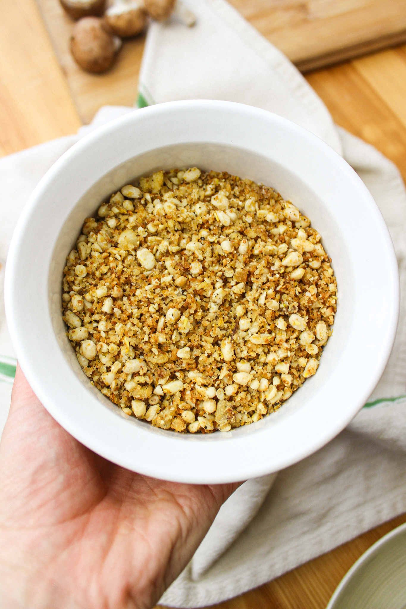 The filling of these mushrooms is truly irresistible. Subtle in flavour, cashews create a creamy base for the filling, that is then packed with flavour from miso, nutritional yeast, and lemon. Of course, to reduce waste, and because they’re totally edible, we use the mushroom stems in the filling to add texture and more umami flavour. With the addition of artichoke and spinach, the filling resembles the iconic spinach and artichoke dip that we all know and love, but better, because everything is better with mushrooms! Finally, the little shroomies are topped with garlicky panko, giving them a crispy crunch that completes them.