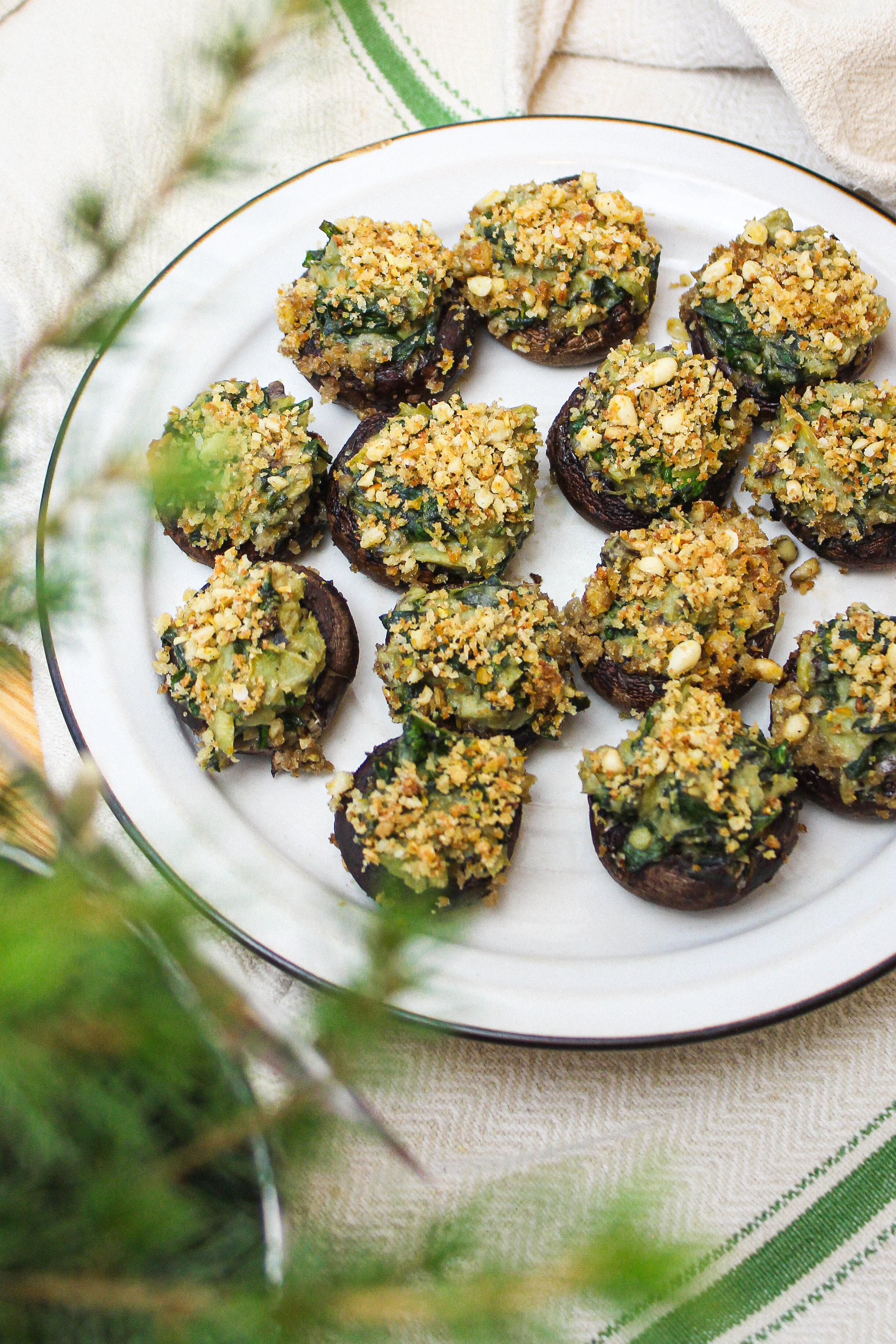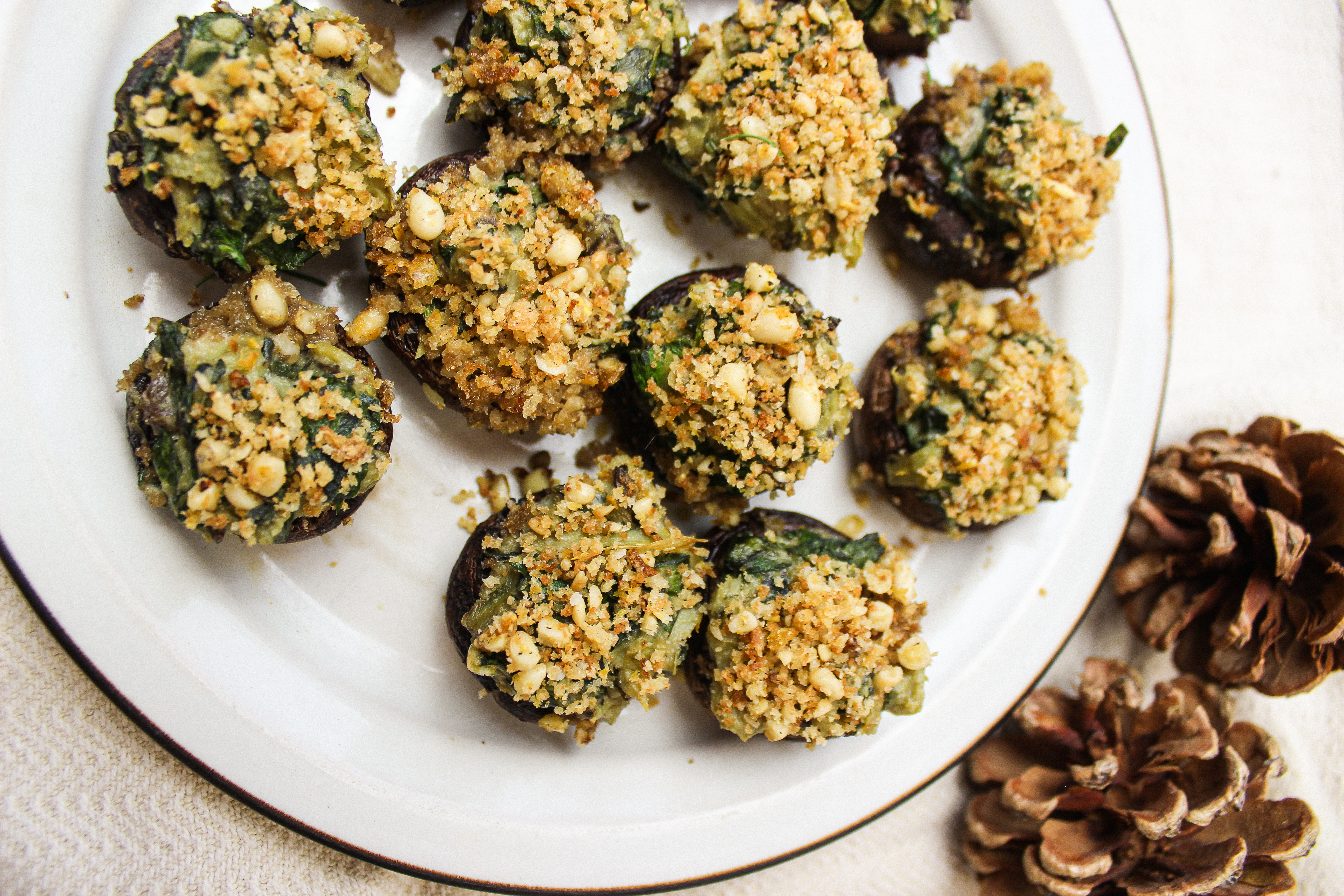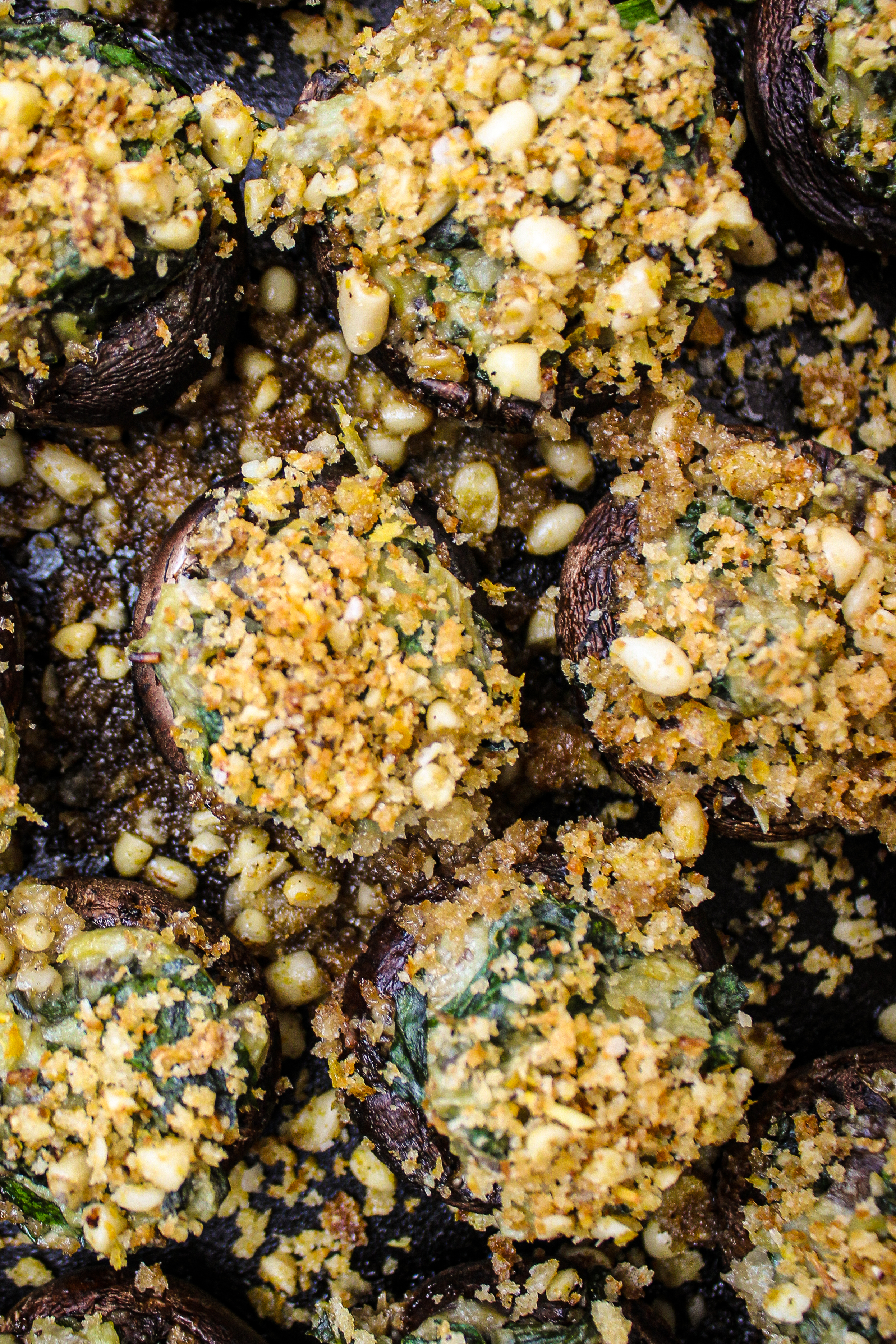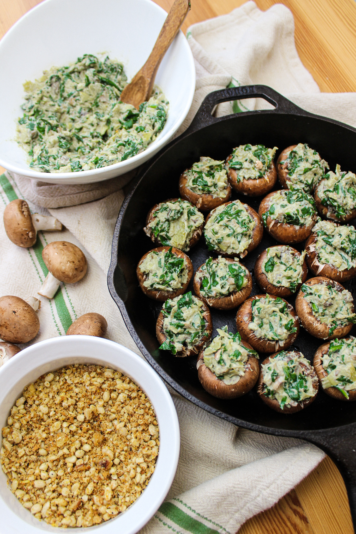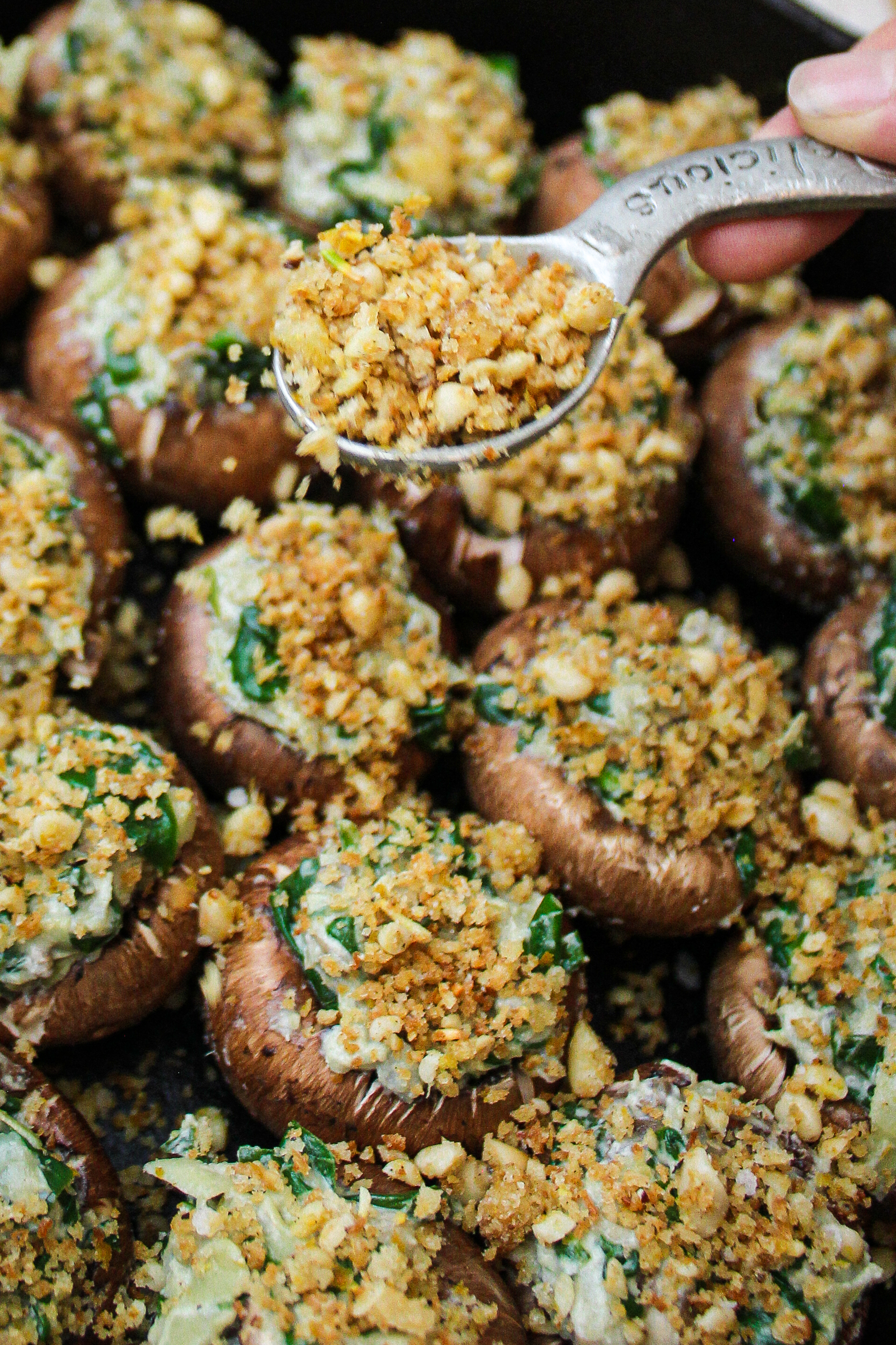 5. To assemble, fill each mushroom cap with a spoonful of spinach and artichoke filling and sprinkle the panko on top. Bake for 25-30 minutes until mushrooms are soft and the tops are golden.