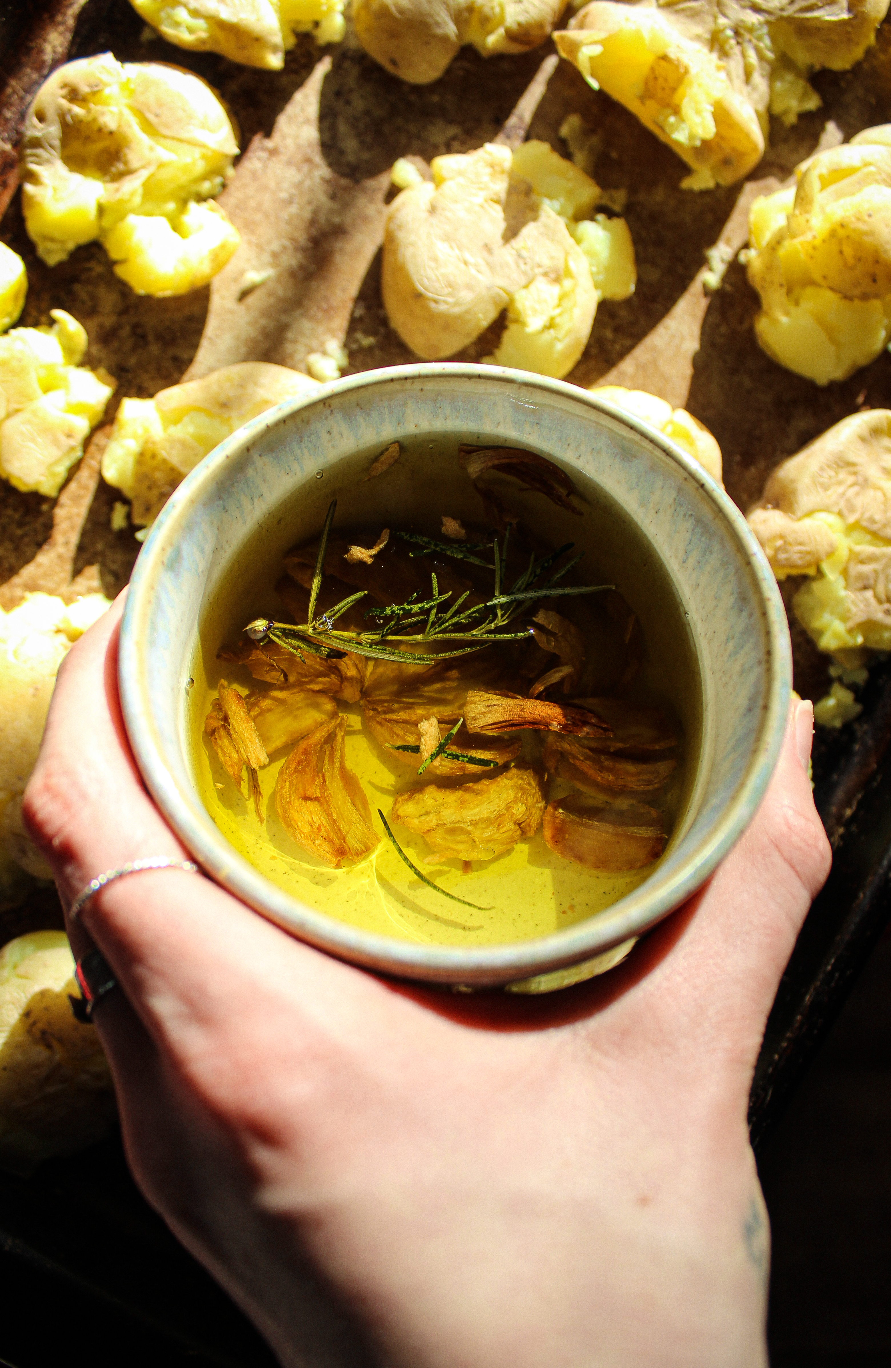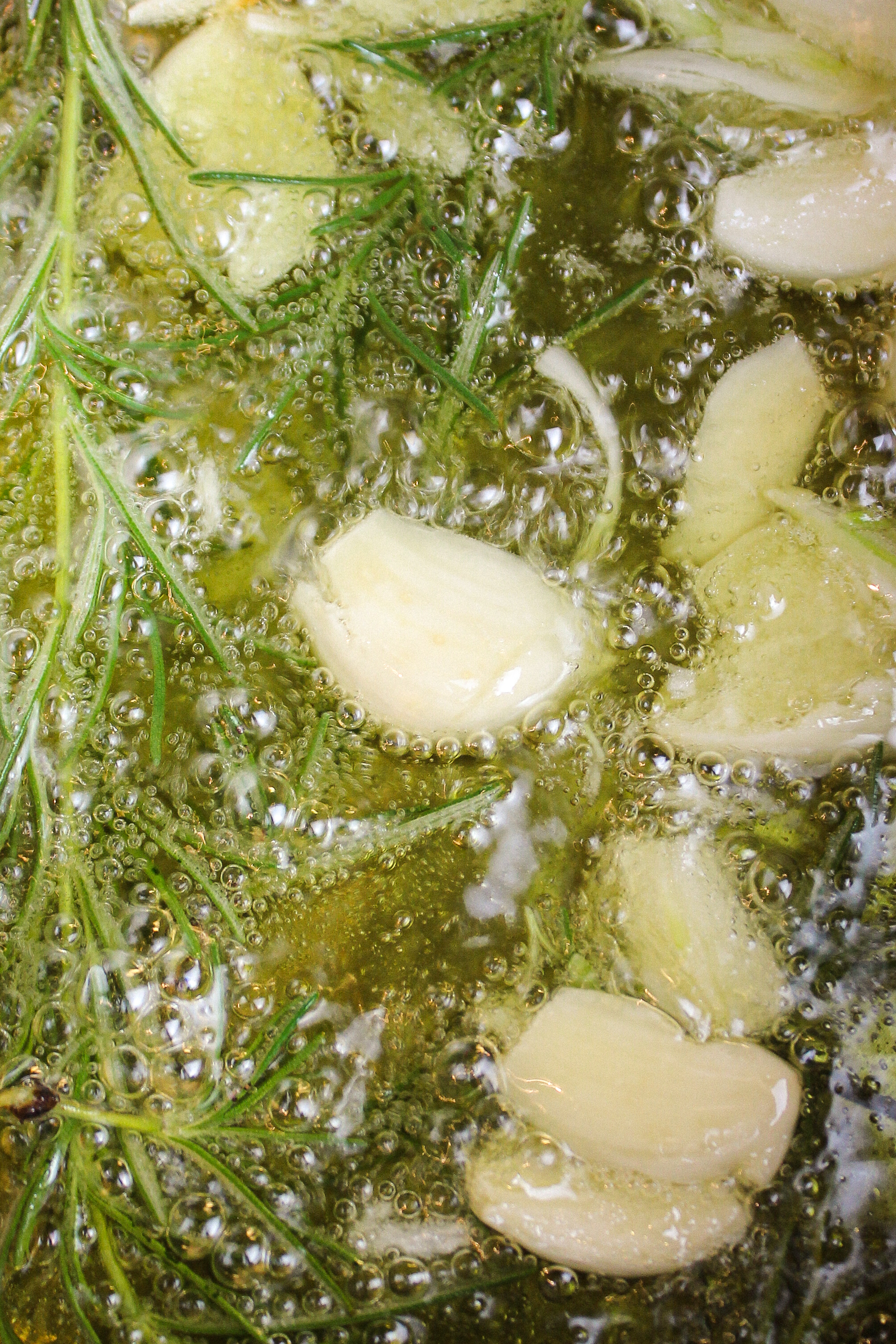 3. Meanwhile, while the potatoes are boiling, make the infused oil. Add olive oil, minced garlic and rosemary to a pot and cook over medium heat until sizzling, but not brown, about 3 minutes. Turn off heat, and let sit for 10 minuntes.