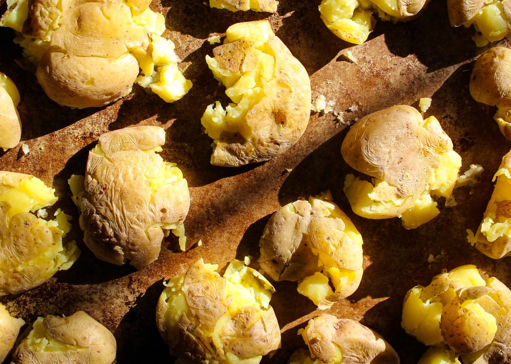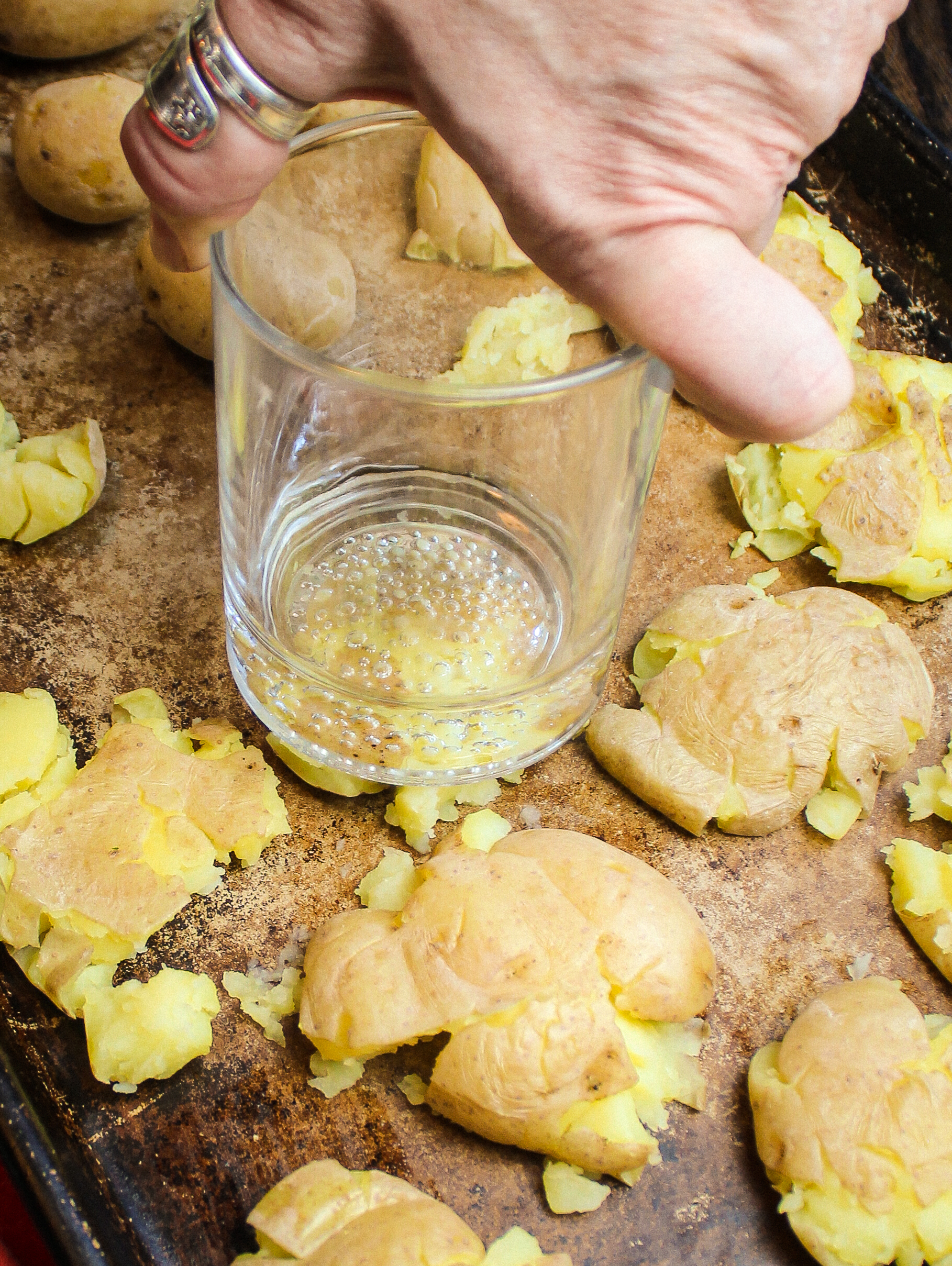 5. Transfer potatoes to a baking sheet and spread them out in an even layer. Using the bottom of a glass, push down firmly to smash until the potatoes are ½ inch thick. Roast the smashed potatoes in the oven for about 40 minutes, until they are golden-brown and crispy.
