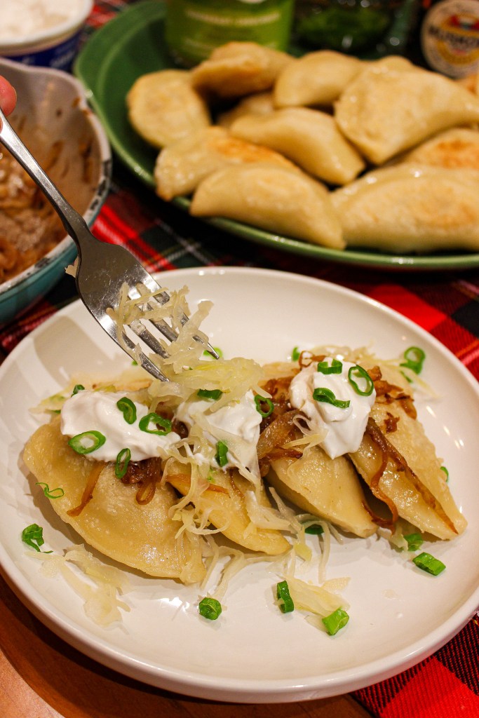 10. Serve hot with the caramelized onions on top. Additionally, serve with sauerkraut, vegan sour cream, and chives for the ultimate pierogi experience!