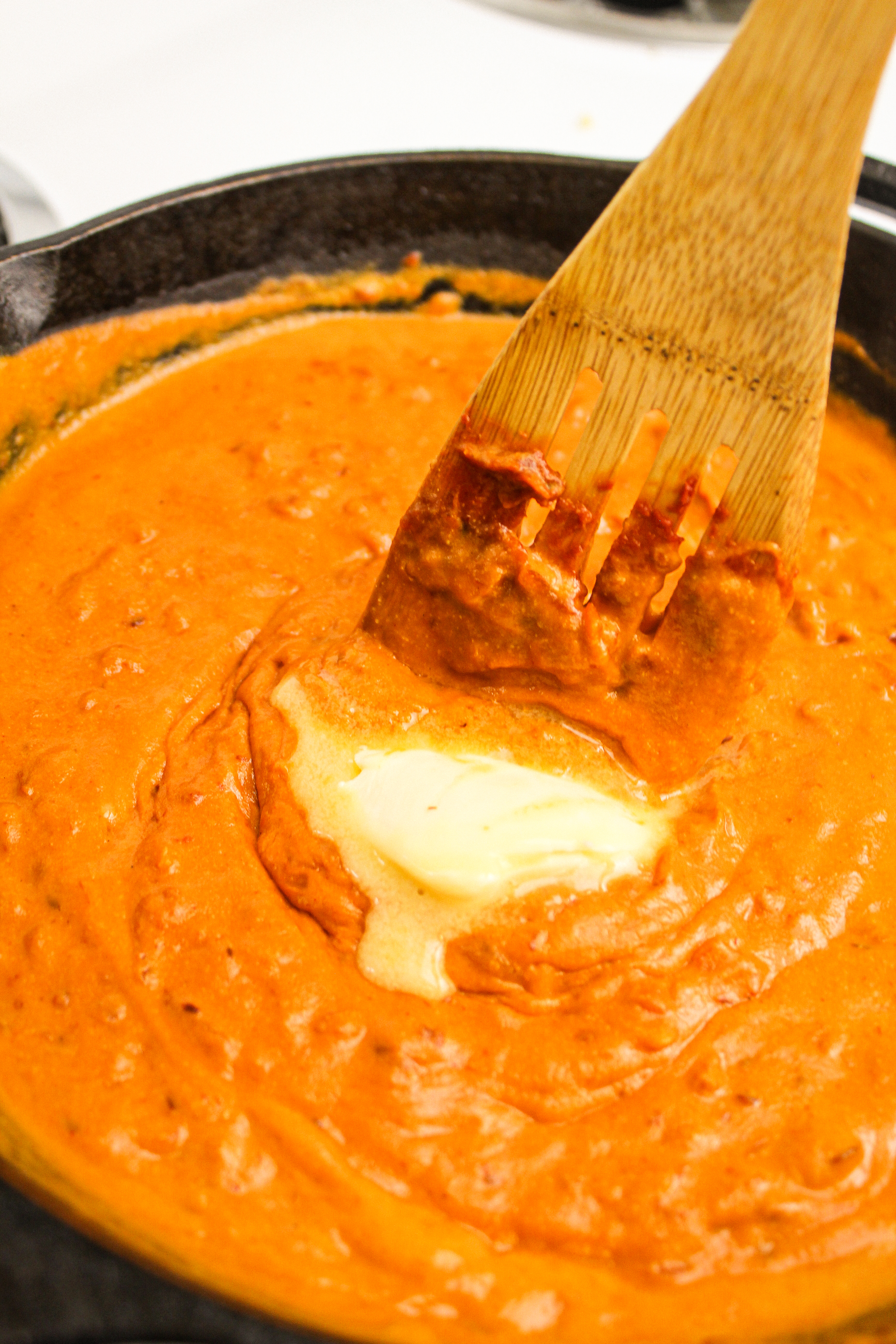 3. Heat 1 tablespoon butter in a cast-iron skillet or pan over medium heat. Add minced garlic and diced shallots, cook until soft, about 3 minutes. Add tomato paste and chilli flakes; cook for about 4 to 5 minutes – the colour will darken to a dark red/brown. Add vodka and stir continuously until the pan is deglazed and mixed for about 1 minute. Turn off heat, add cashew cream, and stir until combined. Add the reserved pasta water 1/4 cup at a time while stirring, until the sauce becomes very smooth and to your desired consistency/thickness. Stir in 1 tablespoon of butter and mix well.