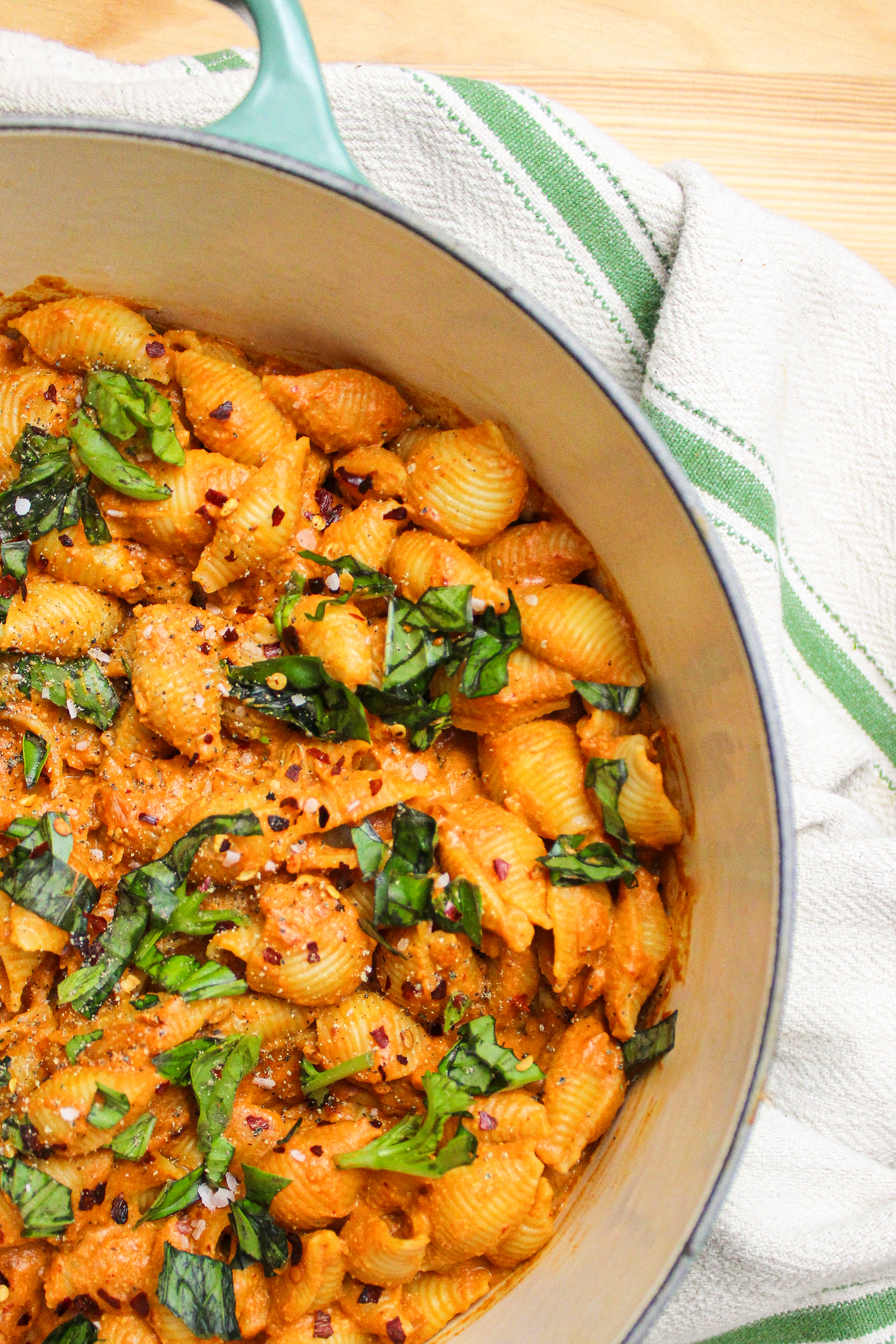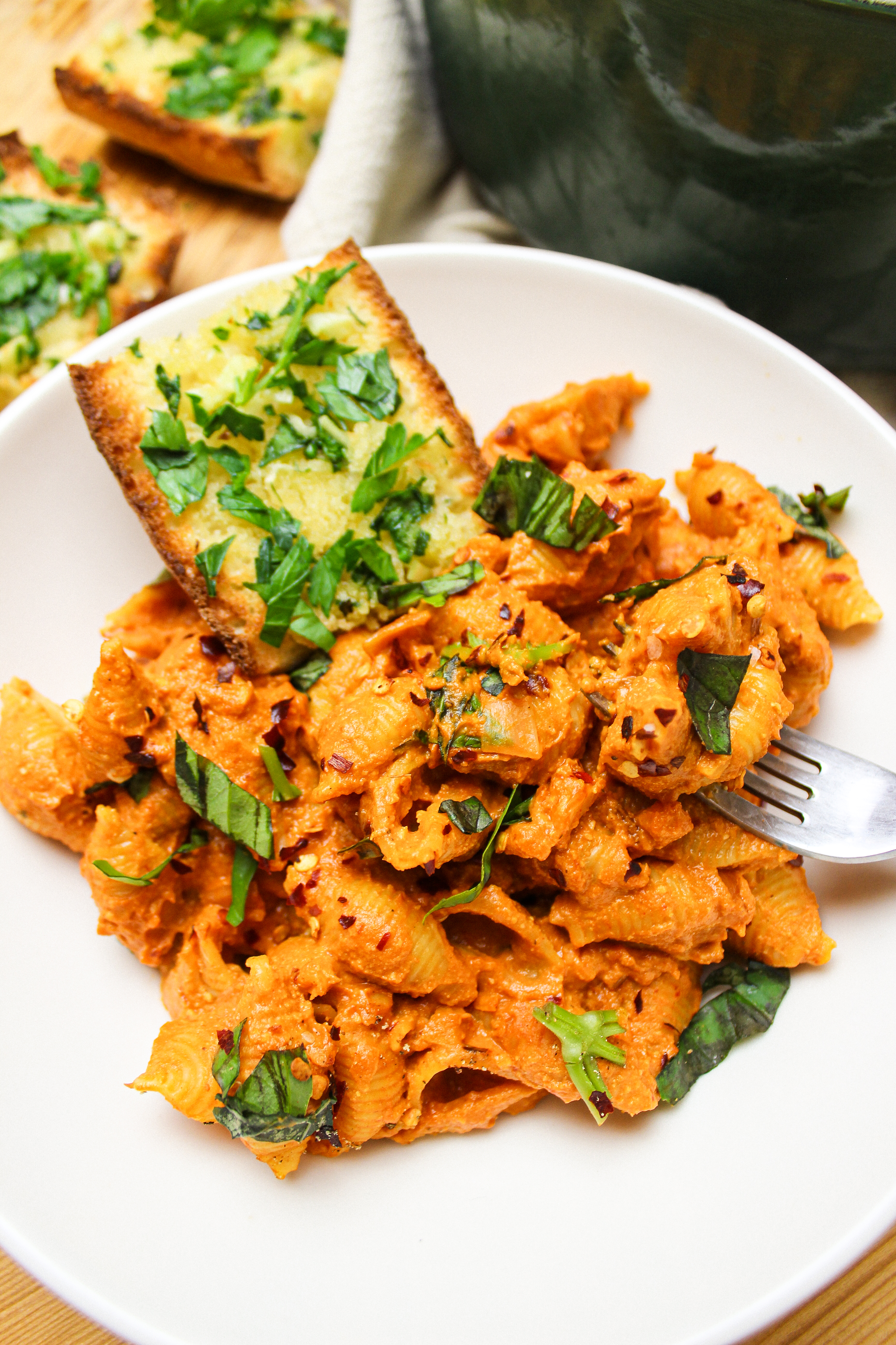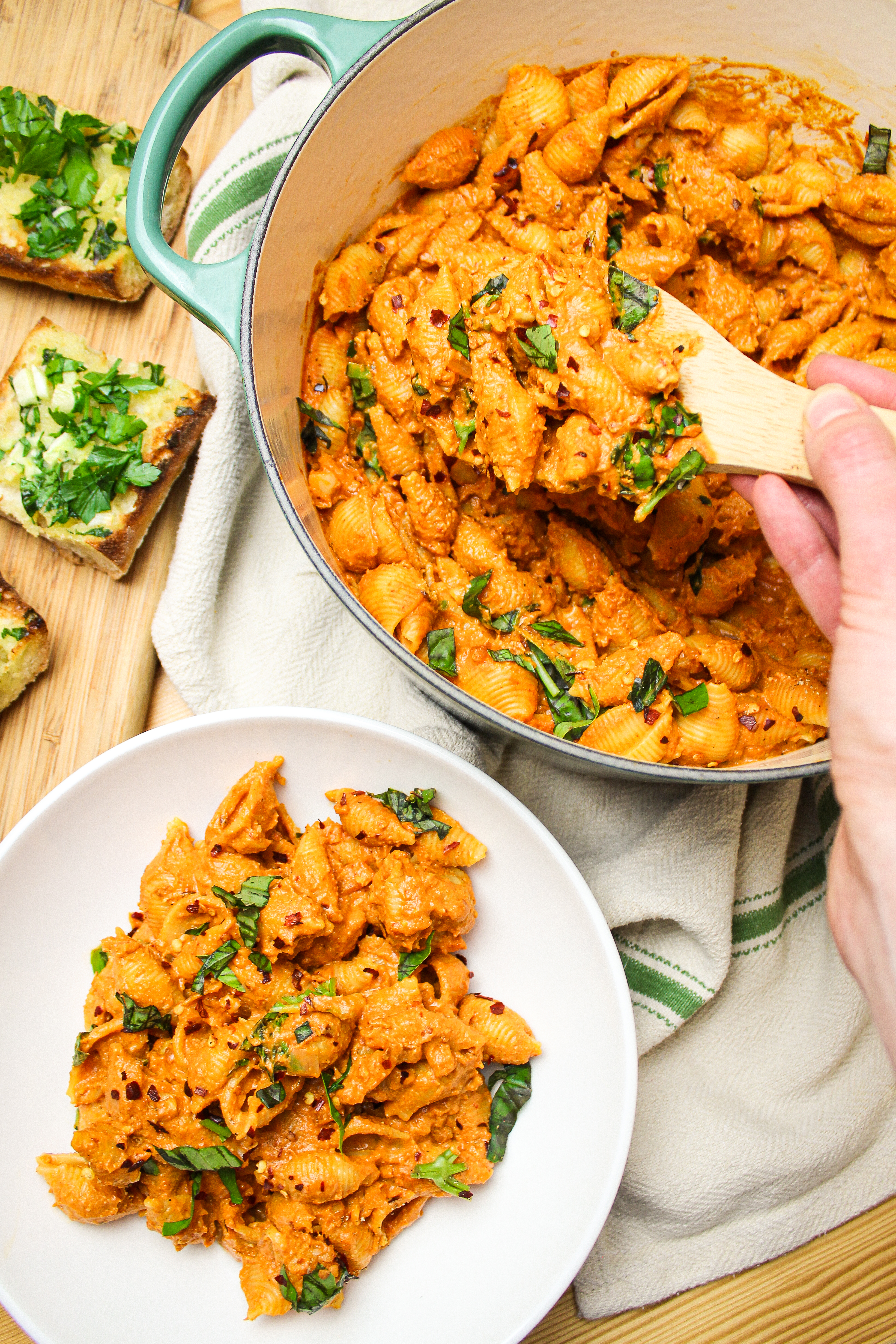 As you gear up for your next pasta night and start the search for a recipe… stop right here! HELLO! Our Spicy Basil Vodka Pasta is quick, indulgent, creamy and packed with flavour! It is sure to impress and take your pasta night to the next level. We’ve all seen Gigi Hadid’s famous Spicy Vodka Pasta recipe as it took over Instagram and TikTok… and we’ve definitely all drooled over it. It only seemed right for us to not only veganize it, but level it up too, bringing you our Spicy Basil Vodka Pasta!